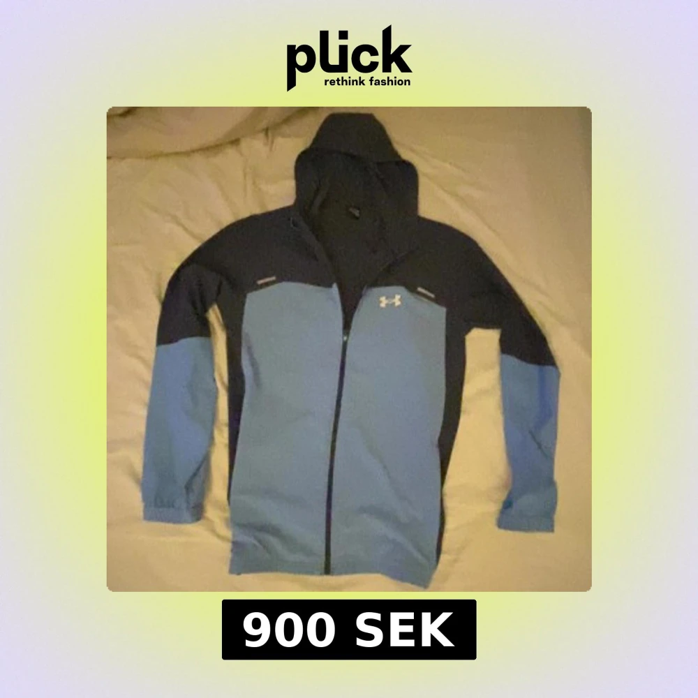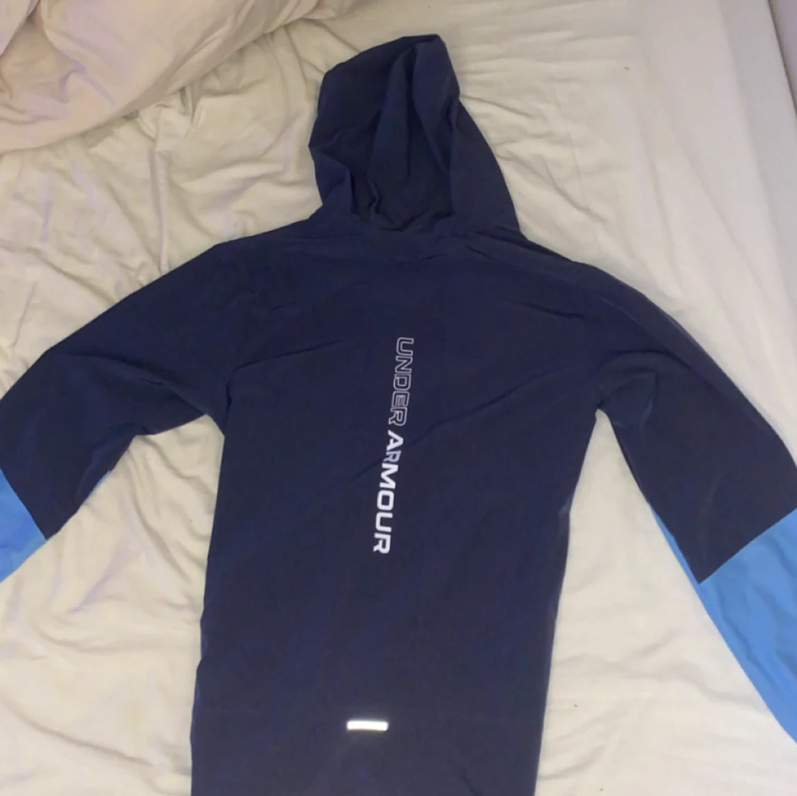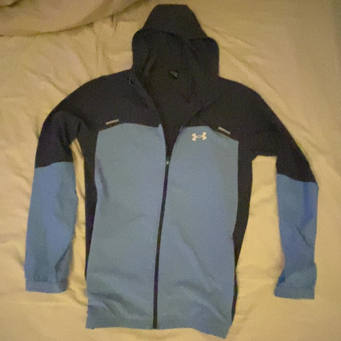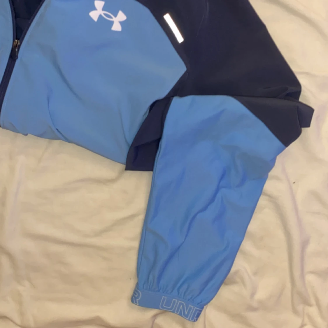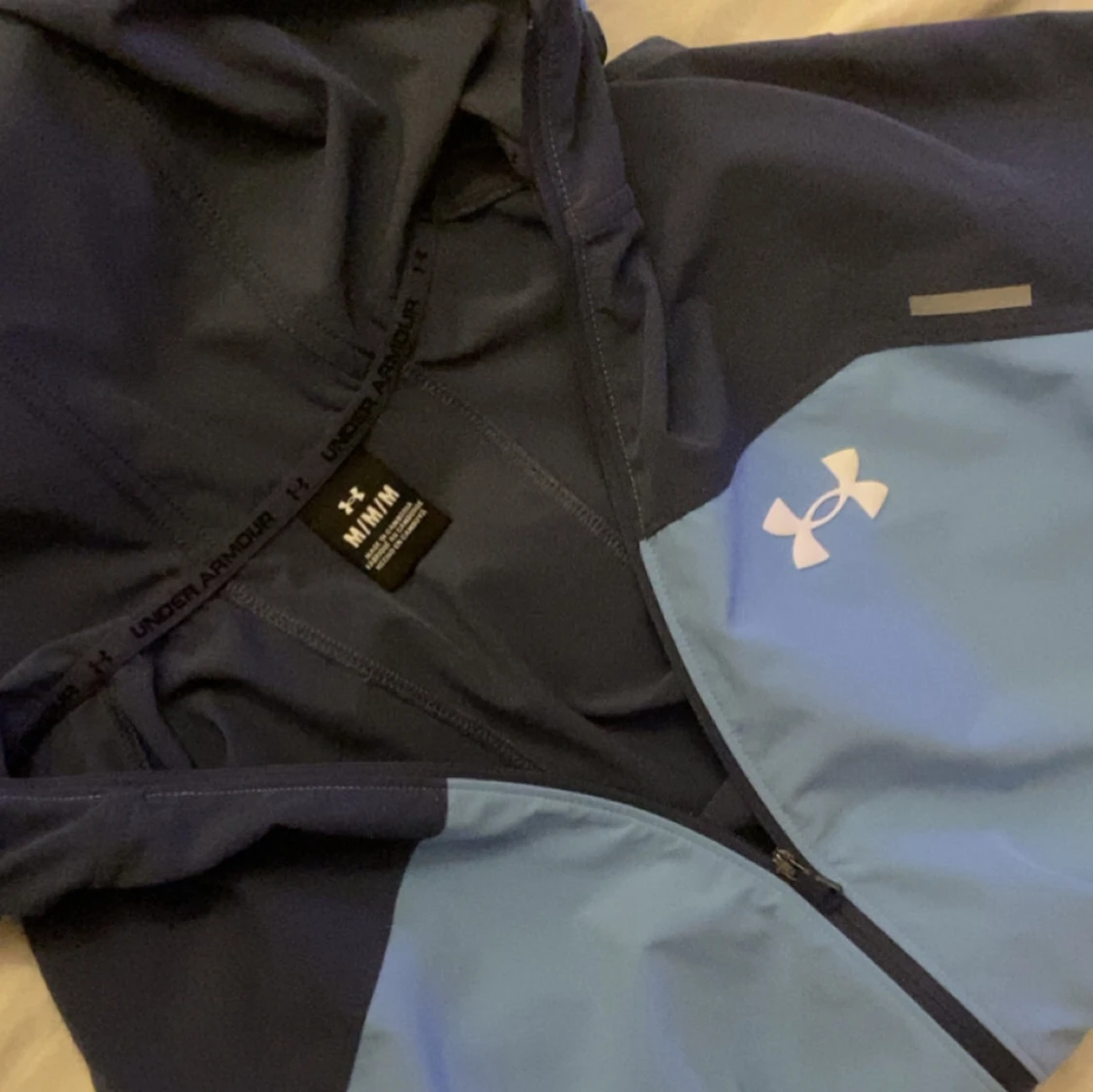 Snygg tvåfärgad vindjacka från Under Armour i marinblått och ljusblått. Jackan har huva, hel dragkedja och reflekterande detaljer. Perfekt för träning utomhus och har logga både fram och bak. Elastiska muddar med diskret logotyp på ärmsluten.