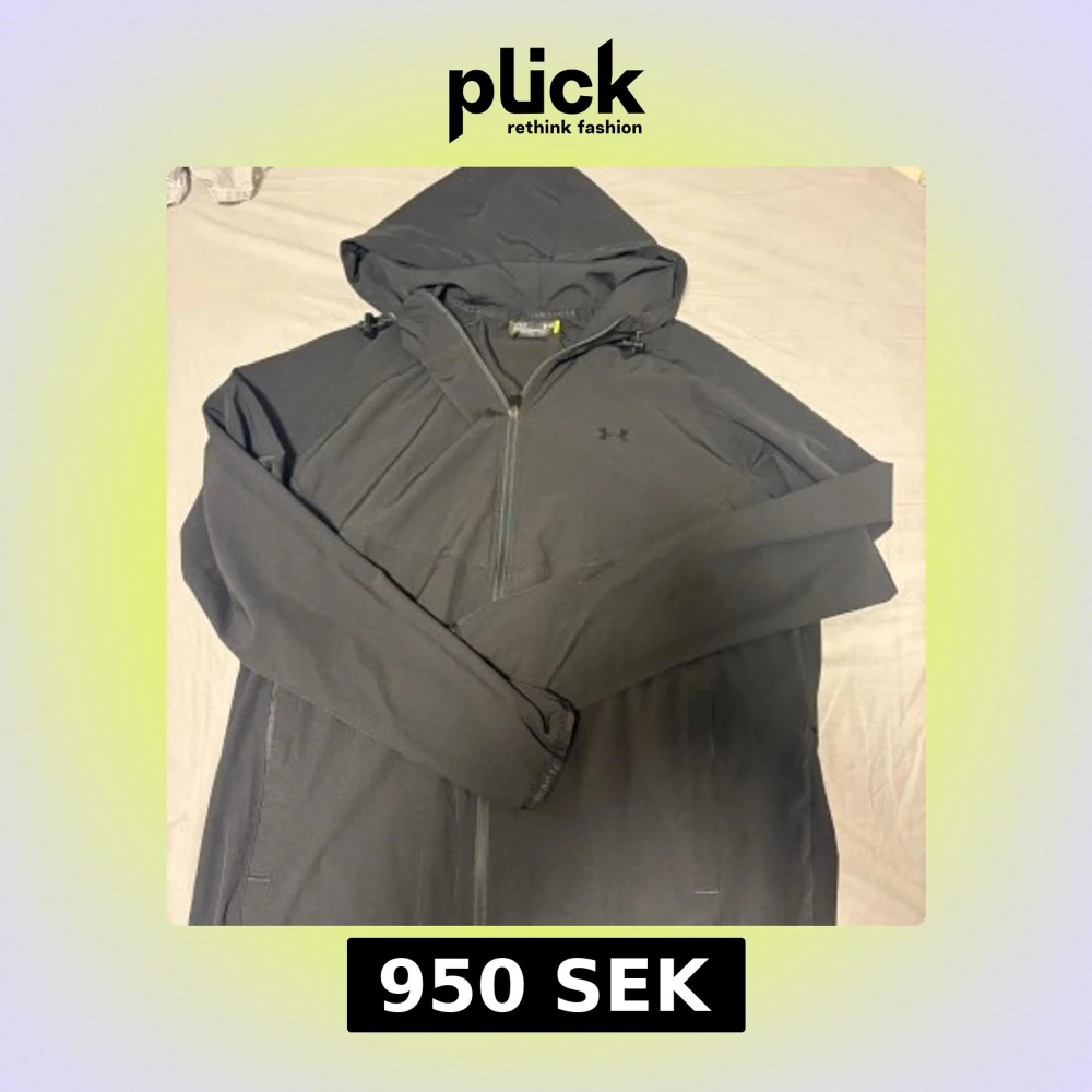Svart vindjacka från Under Armour med huva och justerbar dragsko. Jackan har halv dragkedja framtill, två sidofickor och diskret logga på bröstet. Perfekt för blåsiga dagar och sportiga outfits.