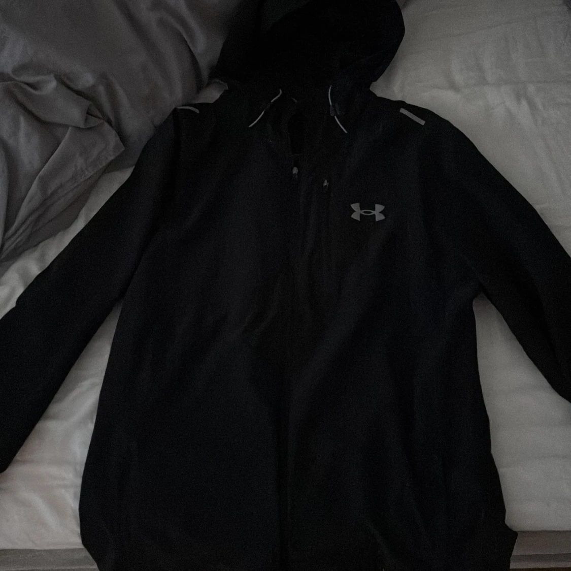 Svart vindjacka från Under Armour med huva och reflekterande detaljer. Jackan har dragkedja framtill och logga på bröstet. Perfekt för löpning eller utomhusaktiviteter. Tillverkad i lätt polyester för maximal rörelsefrihet.