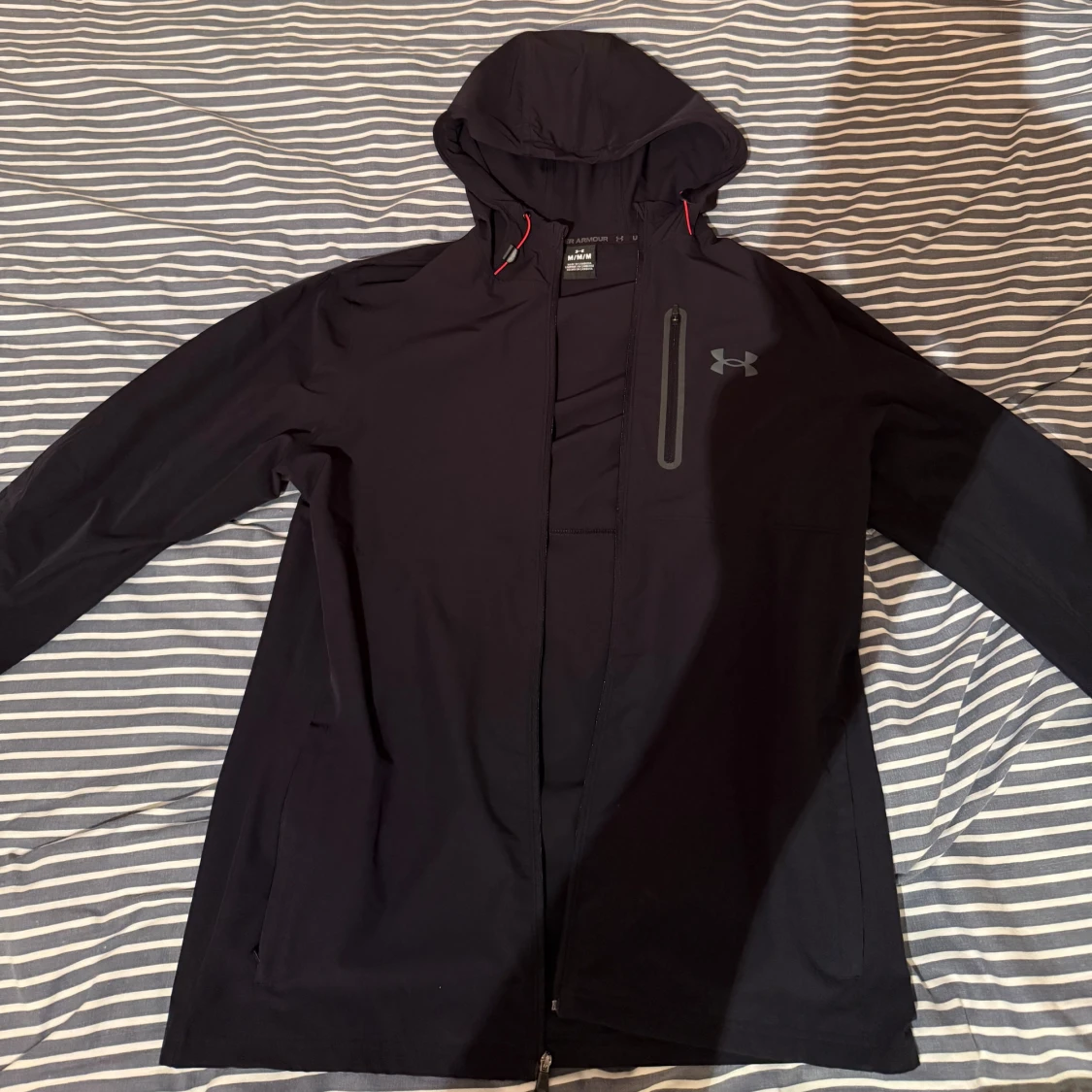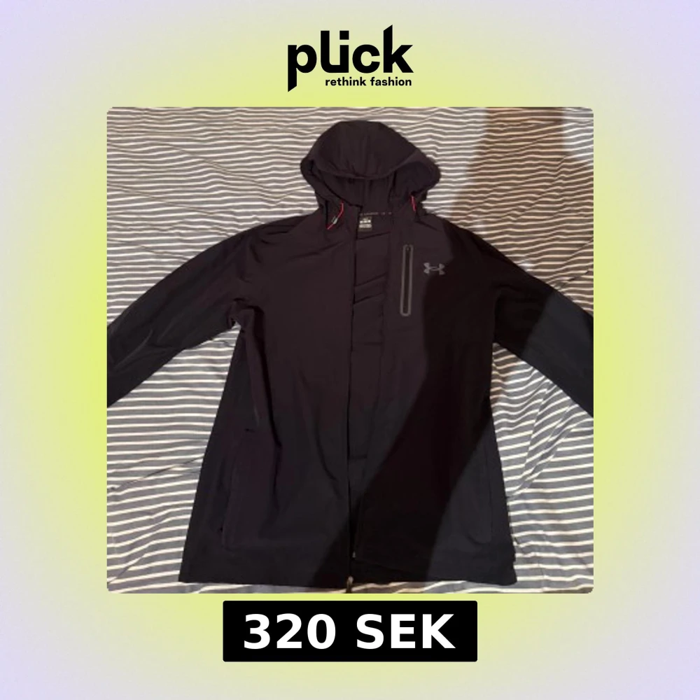 Svart vindjacka från Under Armour med huva och dragkedja. Jackan har en bröstficka med dragkedja och diskret logga på bröstet. Långärmad modell med sportig känsla, perfekt för blåsiga dagar. Snygga röda detaljer vid huvan. Dragkedjan är trasslig den går att stänga men åker upp ofta