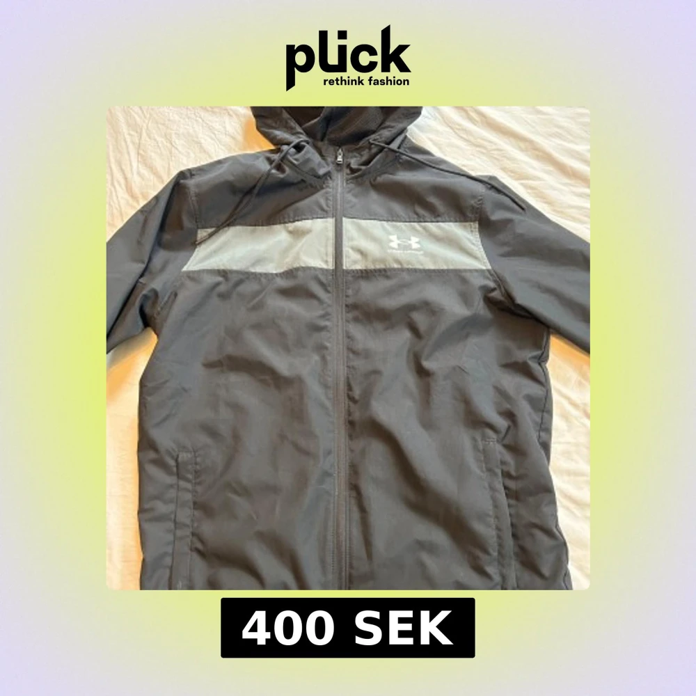 Säljer en svart vindjacka från Under Armour med grått bröstparti och logga. Jackan har huva med snörning, dragkedja framtill och två sidofickor. Perfekt för blåsiga dagar och sportiga outfits.