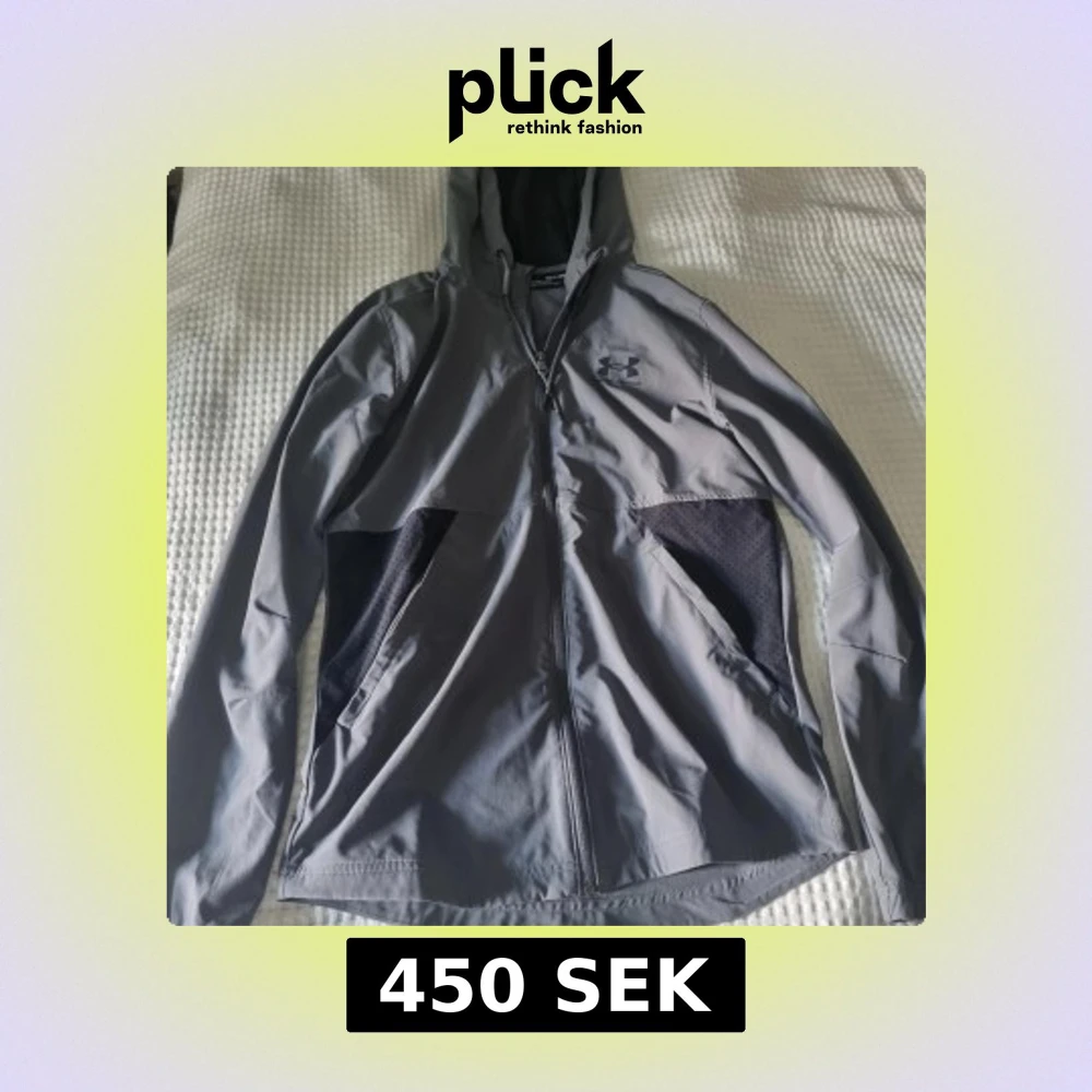 Grå vindjacka från Under Armour med huva och dragkedja hela vägen. Jackan har långa ärmar, två fickor framtill och meshdetaljer på sidorna för extra ventilation.