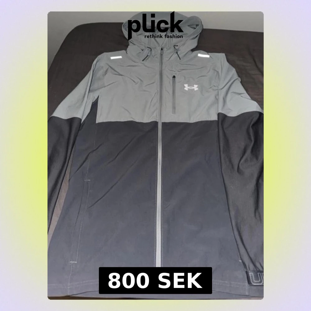Snygg tvåfärgad vindjacka från Under Armour i grått och svart med huva och hel dragkedja framtill. Jackan har en bröstficka med dragkedja och logga på bröstet. Perfekt för utomhusaktiviteter och träning när det blåser.
