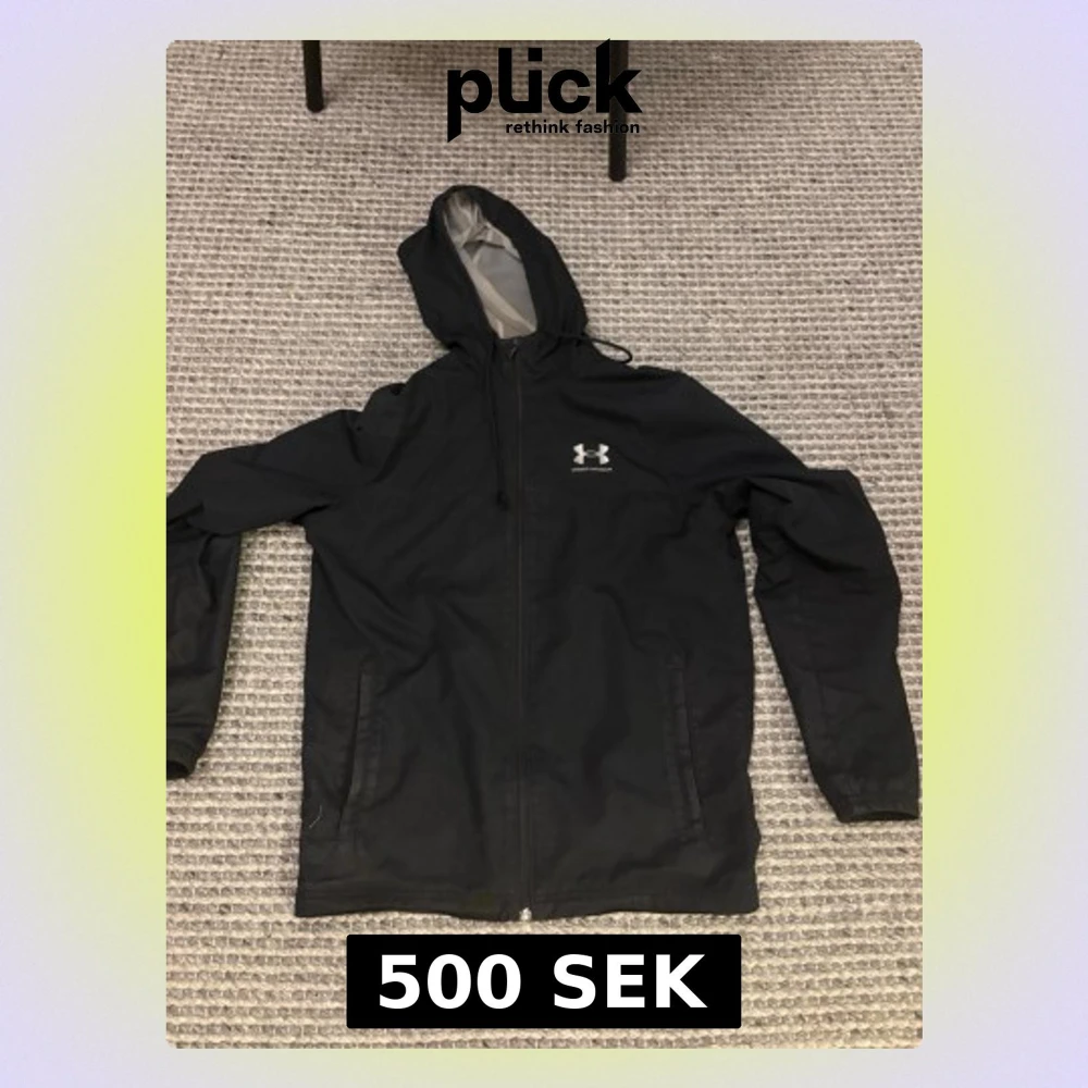 Säljer en svart vindjacka från Under Armour med huva och meshfoder. Jackan har dragkedja framtill, två sidofickor och logga på