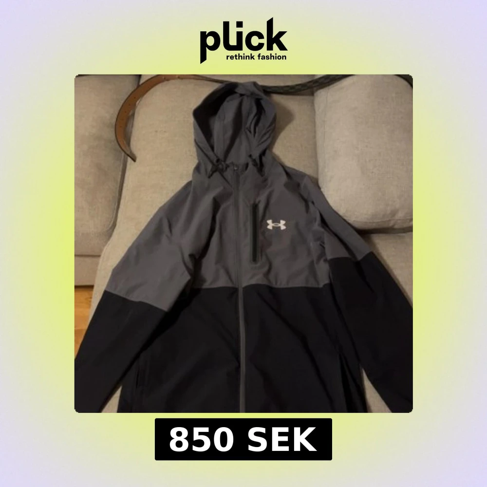 Snygg svart och grå vindjacka från Under Armour med huva och hel dragkedja. Jackan har en bröstficka med dragkedja och logga på bröstet. Perfekt för blåsiga dagar och sportiga outfits.