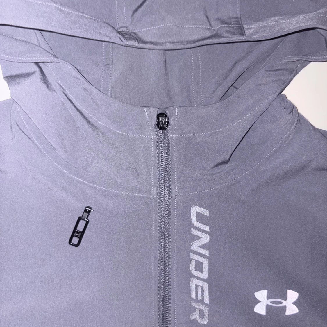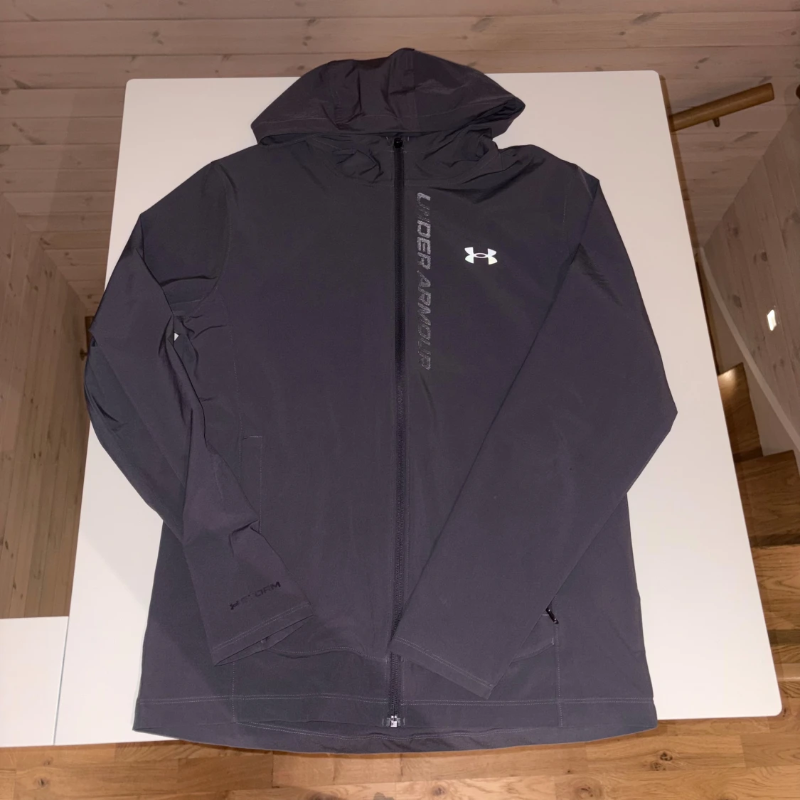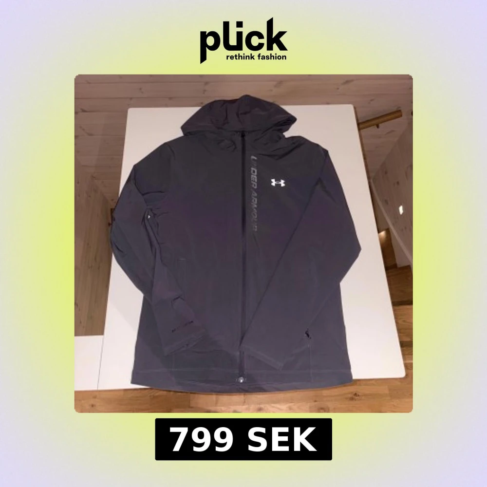 Snygg svart vindjacka från Under Armour med huva och hel dragkedja framtill. Jackan har logga och text på bröstet, samt diskreta fickor i sidorna. Perfekt för dig som gillar sportig stil och vill ha något lätt och funktionellt. (OBS dragkedjan är trasig men det går forfarande att knäppa upp och ner jackan felfritt, går förmodligen och fixa dragkedjan hos någon kunnig‼️‼️)