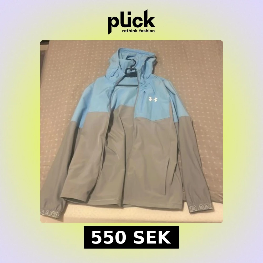 Snygg tvåfärgad vindjacka från Under Armour i ljusblått och grått. Jackan har huva, dragkedja framtill, lång ärm och logga på bröstet. Perfekt för blåsiga dagar och sportiga outfits. Materialet är lätt och känns smidigt mot kroppen. Str s och m