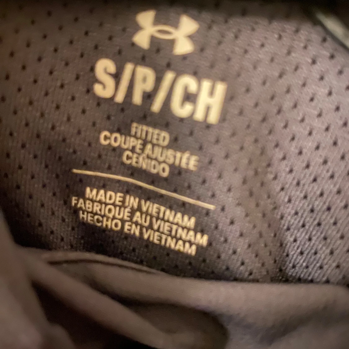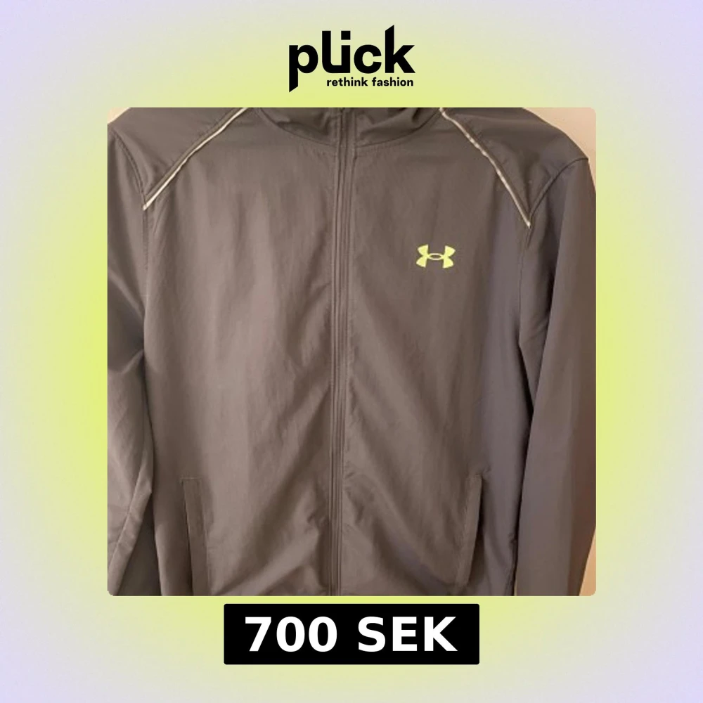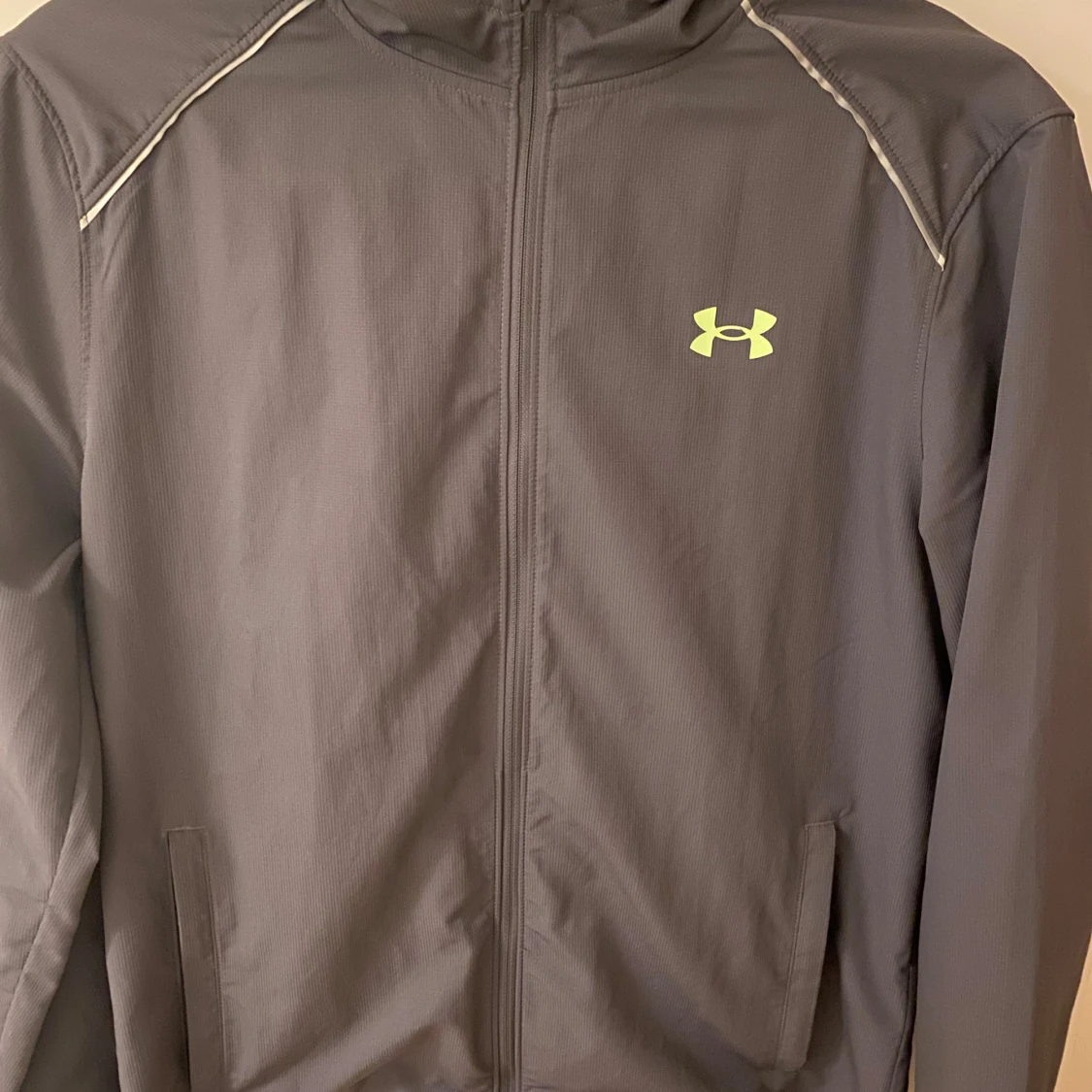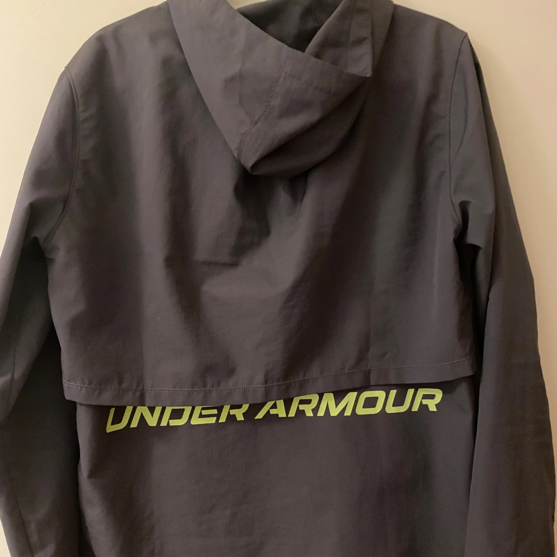 Svart vindjacka från Under Armour med huva och dragkedja framtill. Jackan har neongult logotryck på bröstet och stor Under Armour-text på ryggen. Tillverkad i lätt polyester, perfekt för träning eller när du vill ha en sportig look. Storlek S och även i bra skick