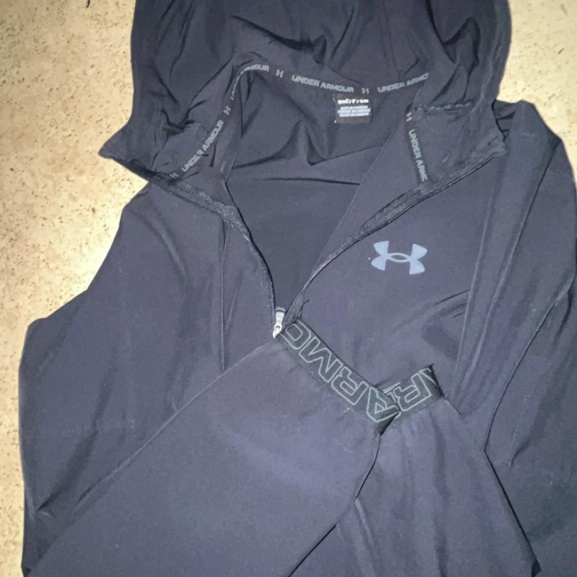 Svart vindjacka från Under Armour med stilren design och logga på bröstet. Jackan har hel dragkedja framtill, två sidofickor med dragkedja och långärmade ärmar. Perfekt för aktiva dagar och sportiga outfits.