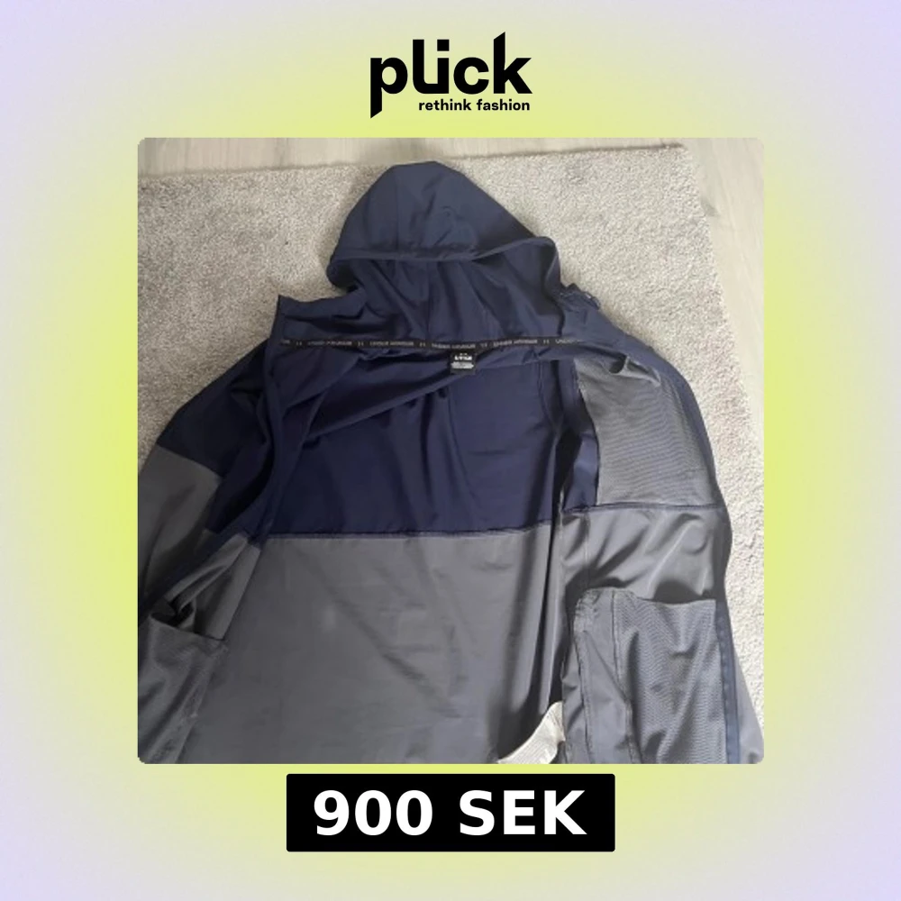 Snygg vindjacka från Under Armour i marinblått och grått. Jackan har huva, hel dragkedja, bröstficka med dragkedja och elastiska muddar med logga. Perfekt för blåsiga dagar och sportiga outfits.