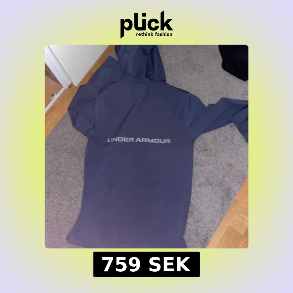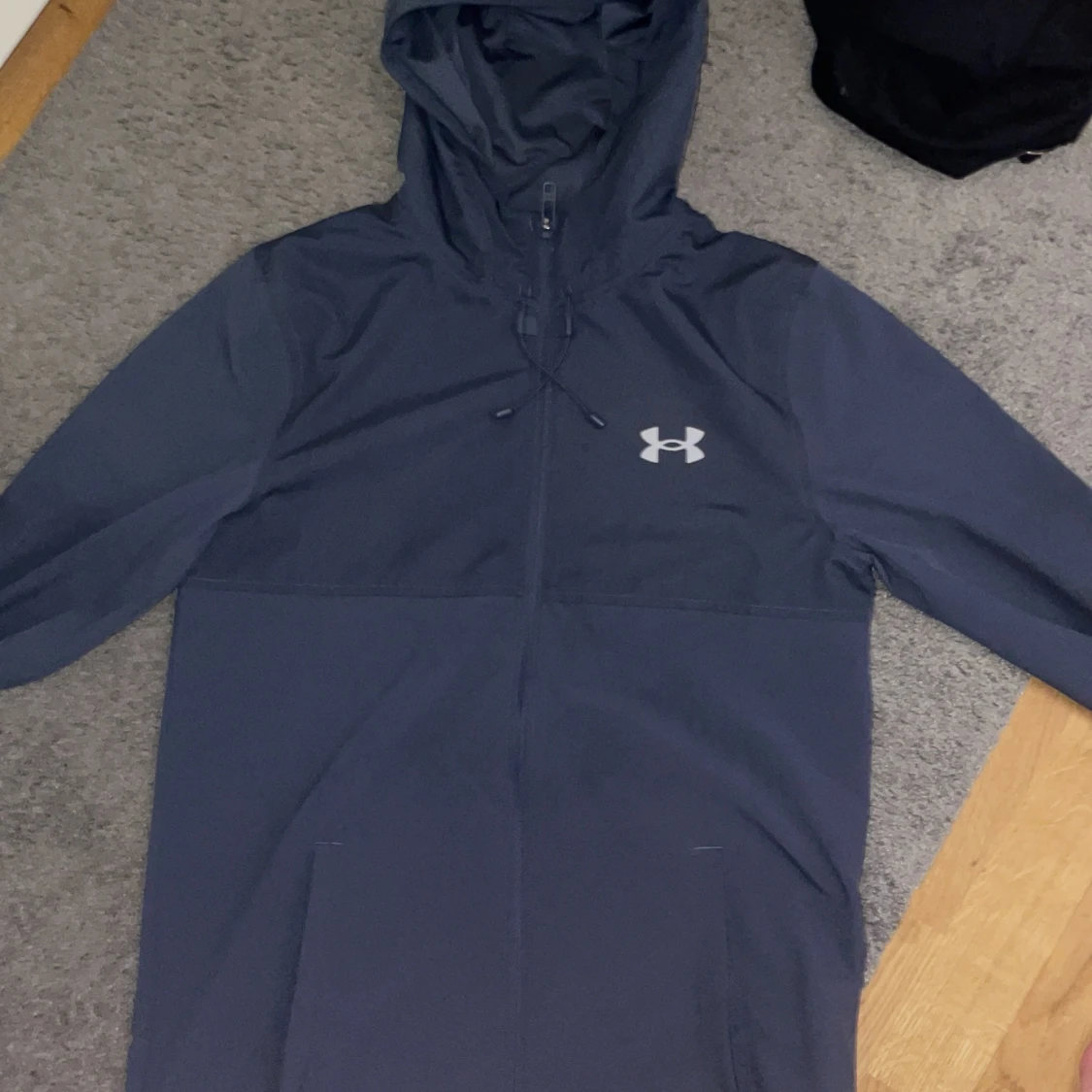 Säljer en snygg marinblå vindjacka från Under Armour med huva och snörning. Jackan har dragkedja framtill, fickor och logga på bröstet samt stort tryck på ryggen. Perfekt för dig som gillar sportig stil och vill ha något lätt och funktionellt.PRIS KAN DISKUTERAS