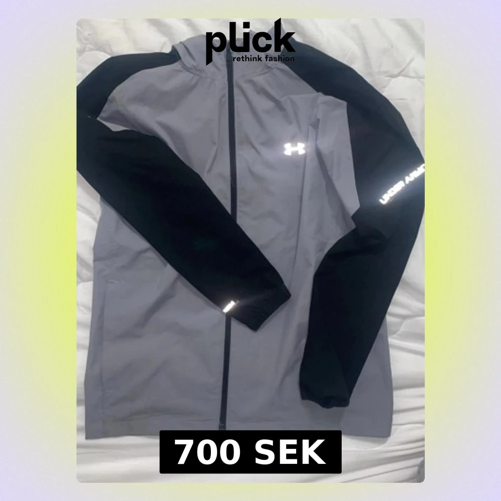 Snygg grå vindjacka från Under Armour med svarta ärmar och hel dragkedja framtill. Jackan har hög krage, reflekterande logga på bröstet och text på ärmen. Perfekt för blåsiga dagar och sportiga outfits.