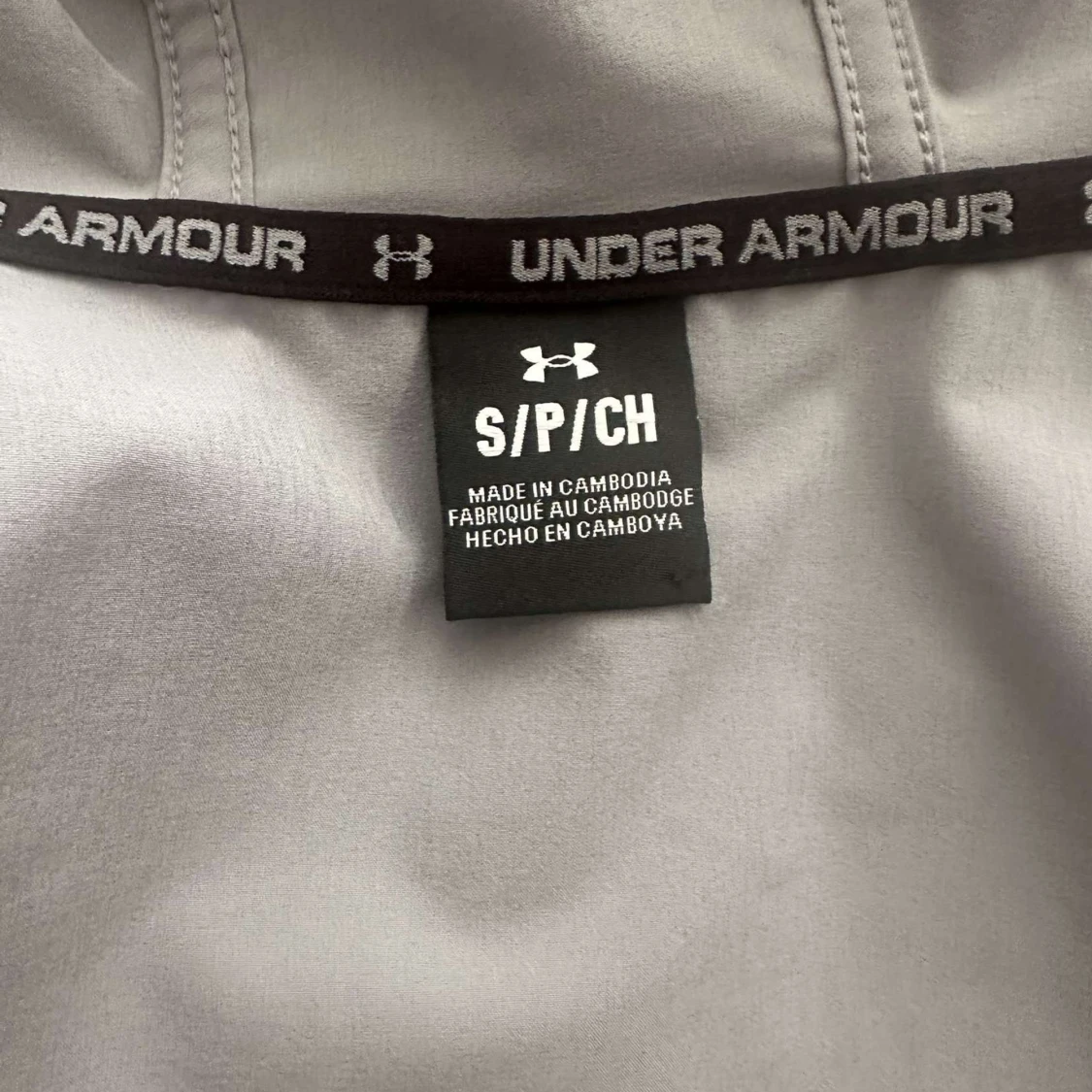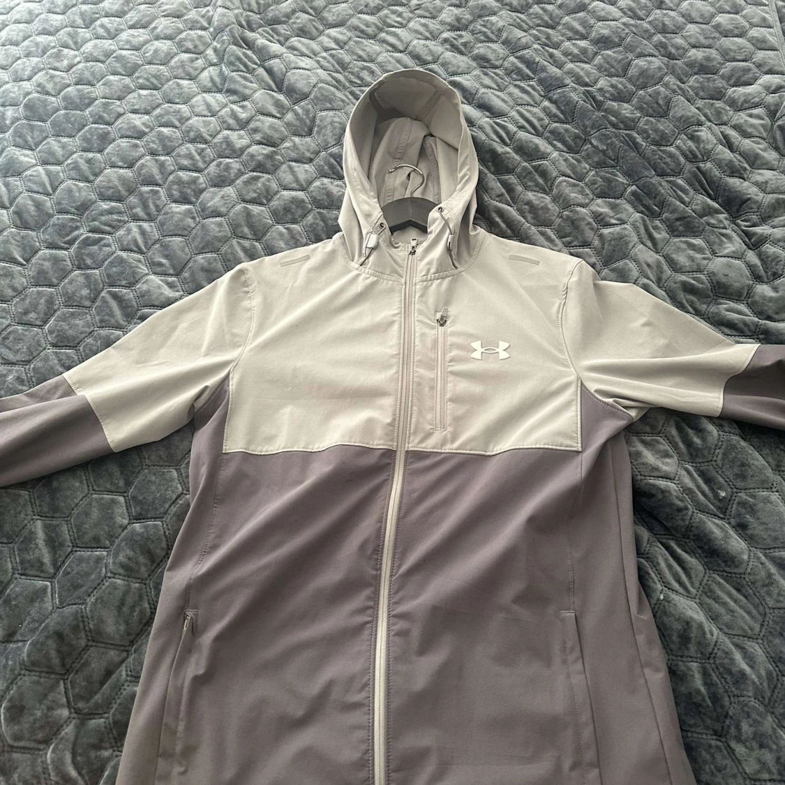 Snygg tvåfärgad vindjacka från Under Armour i ljusgrå och mörkgrå nyans. Jackan har huva med snörning, dragkedja framtill och praktiska fickor. Perfekt för dig som gillar sportig stil och vill ha något lätt och funktionellt.