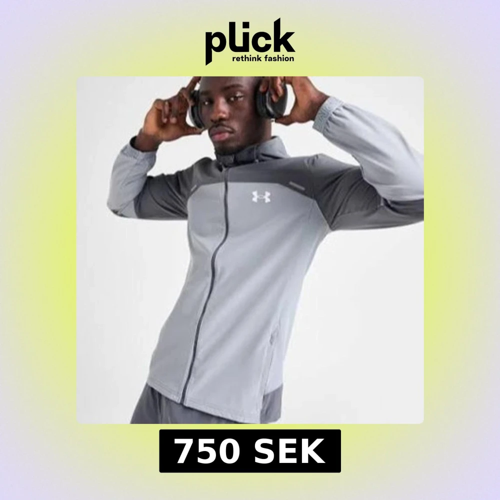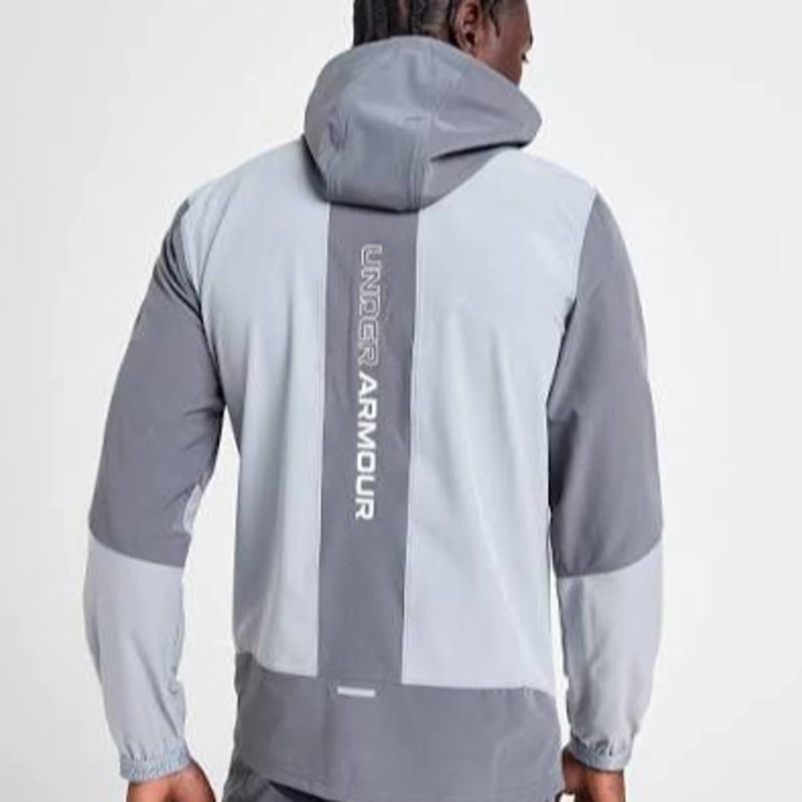 Snygg grå vindjacka från Under Armour med huva och dragkedja framtill. Jackan har två olika grå nyanser, elastiska muddar och logga på bröstet samt stor text på ryggen. Perfekt för träning utomhus och sportiga outfits. Även perfekt present för sig själv eller pojkvän