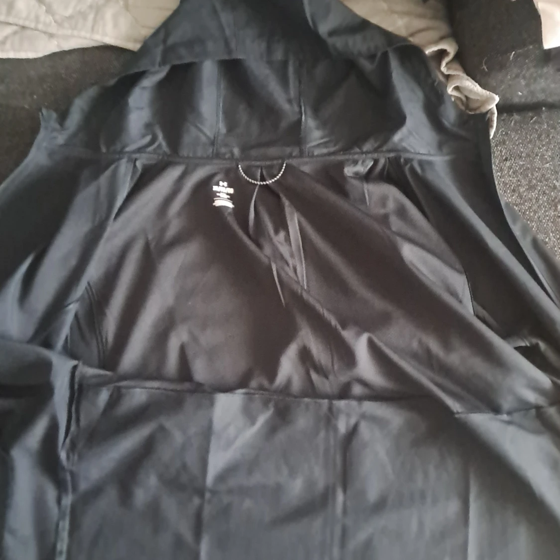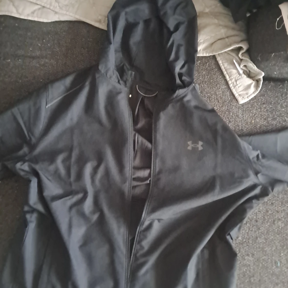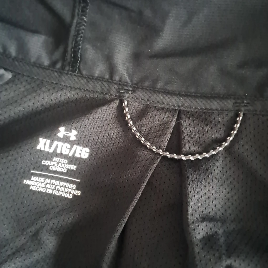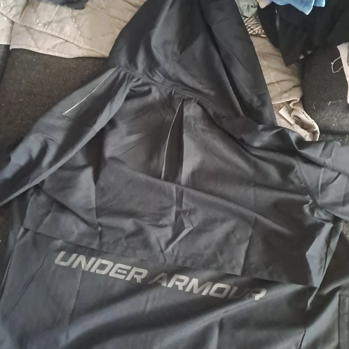 Svart vindjacka från Under Armour i storlek XL. Jackan har huva, dragkedja framtill och är tillverkad i lätt polyester med meshfoder. Perfekt för aktiva dagar och sportiga outfits. Diskret logga på bröstet och sportig passform.