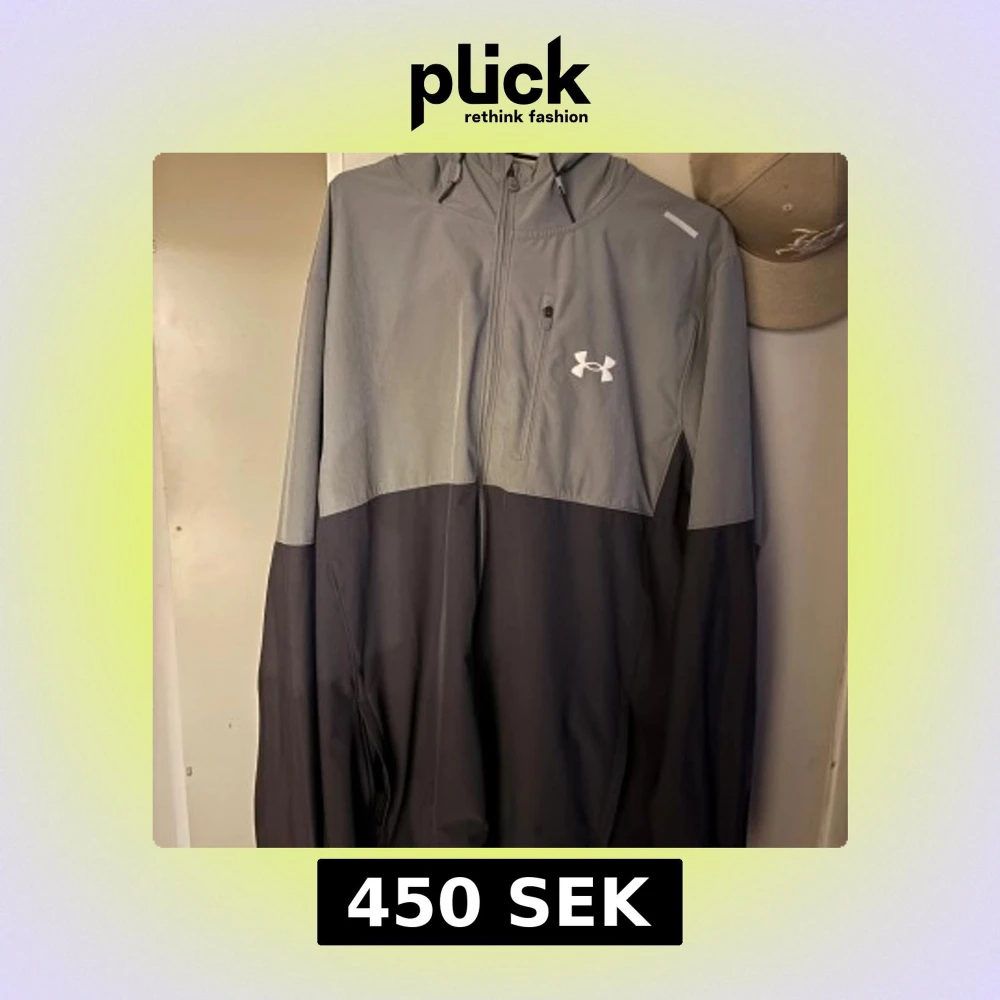 Snygg tvåfärgad vindjacka från Under Armour i grått och svart. Jackan har huva, halv dragkedja framtill, bröstficka med dragkedja och Under Armour-logga på bröstet. Perfekt för dig som gillar sportig stil och vill ha något lätt och funktionellt.
