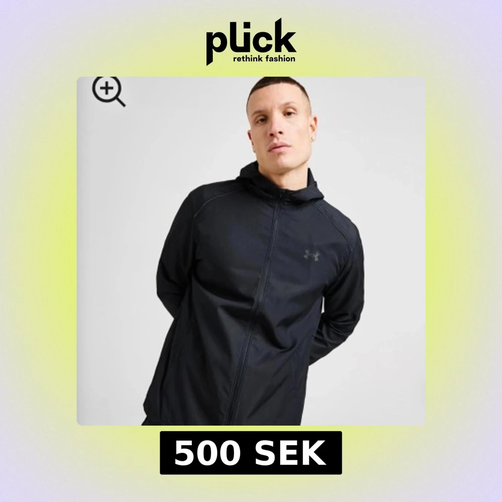 Snygg svart vindjacka från Under Armour med huva och hel dragkedja framtill. Jackan har diskret logga på bröstet och stor Under Armour-text på ryggen. Långärmad och tillverkad i lätt polyester som passar perfekt för aktiva dagar.