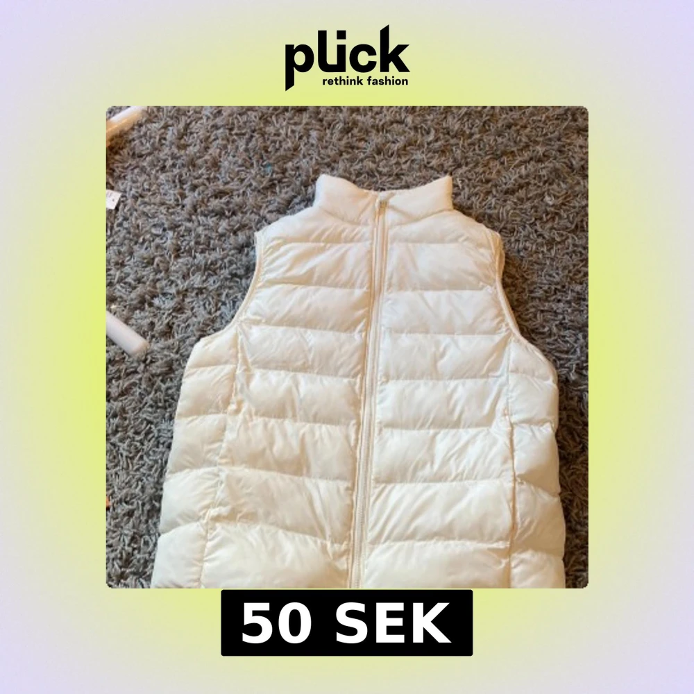 Säljer en fräsch vit dunväst från Uniqlo med ståkrage och dragkedja framtill. Västen har quiltad design och är lätt vadderad, perfekt för lager-på-lager. Passformen är normal och materialet känns mjukt. Enkel och clean look som funkar till jeans eller hoodie. Den passar xs-s