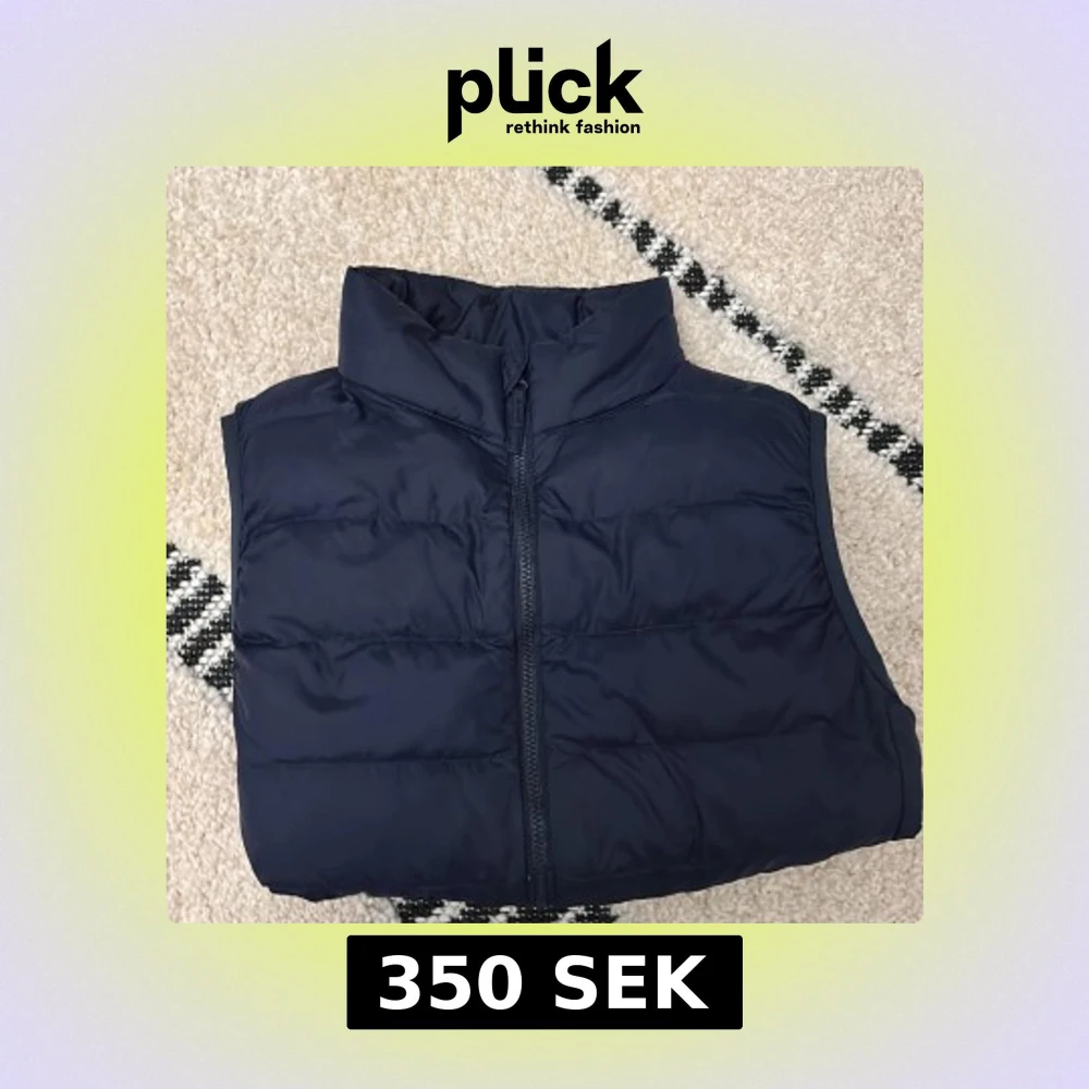 Säljer en stilren mörkblå dunväst från Uniqlo. Västen har hög krage, quiltad design och dragkedja framtill. Perfekt att slänga över en hoodie eller tröja när det är kyligt ute. Enkel och clean look som funkar till det mesta.