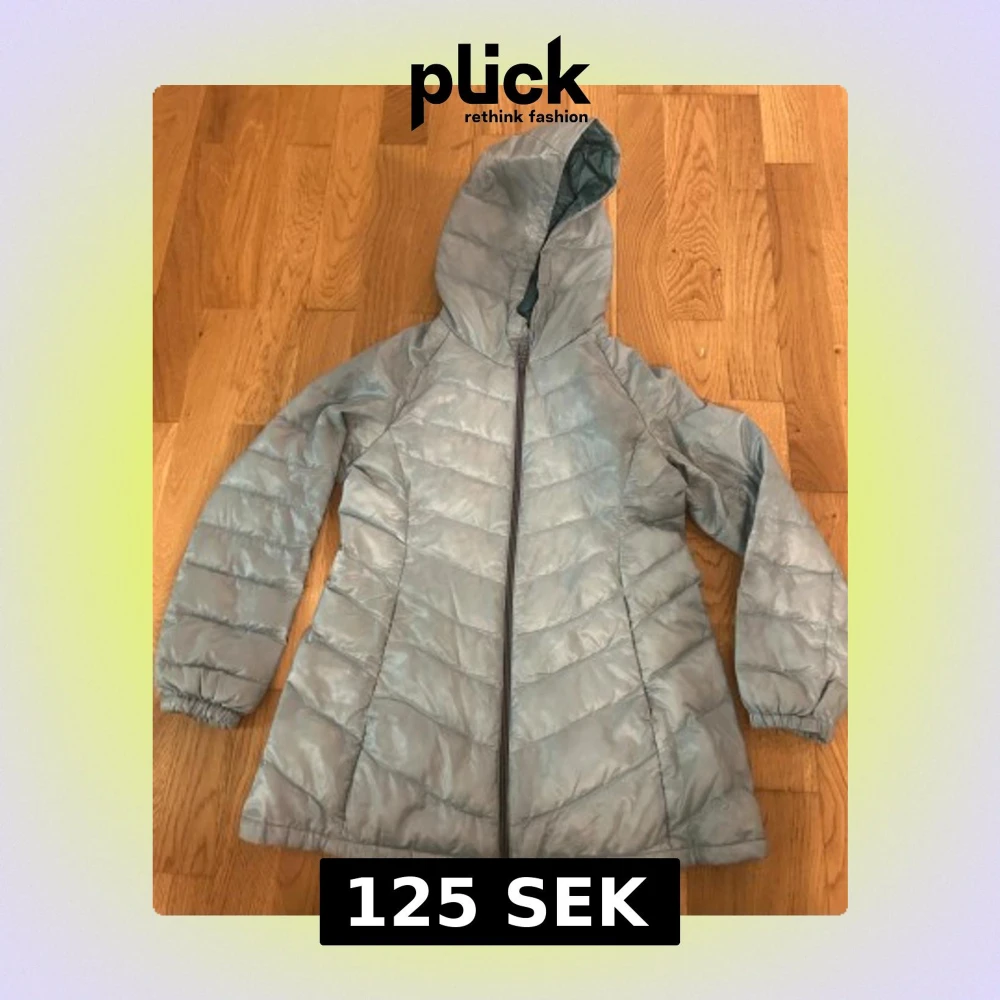 Säljer en tunnare ljusblå dunjacka från Uniqlo med huva och hel dragkedja framtill. Jackan är quiltad och har elastiska muddar vid ärmsluten. Perfekt för kyliga dagar och enkel att matcha med olika outfits.
