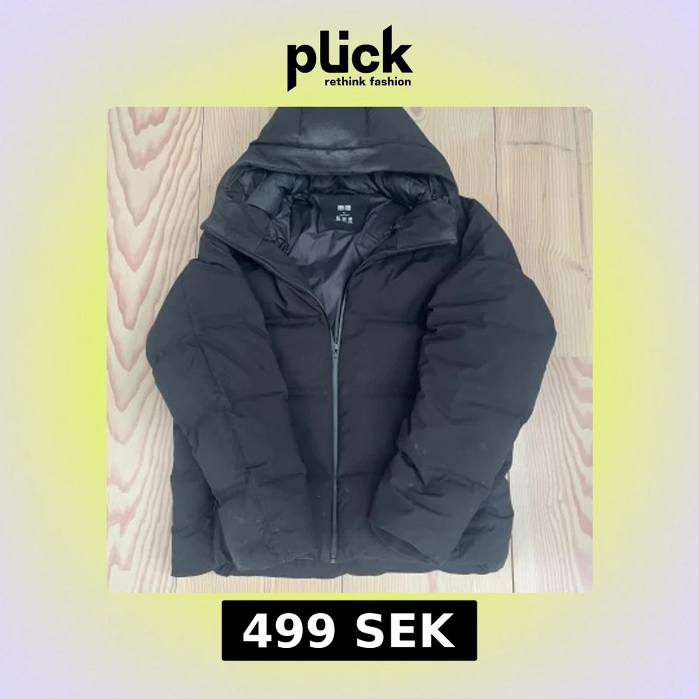 Tjena! Riktigt snygg svart dunjacka från Uniqlo. Storlek XL. Har några små knappt märkbara fläckar. Pris kan självklart diskuteras!