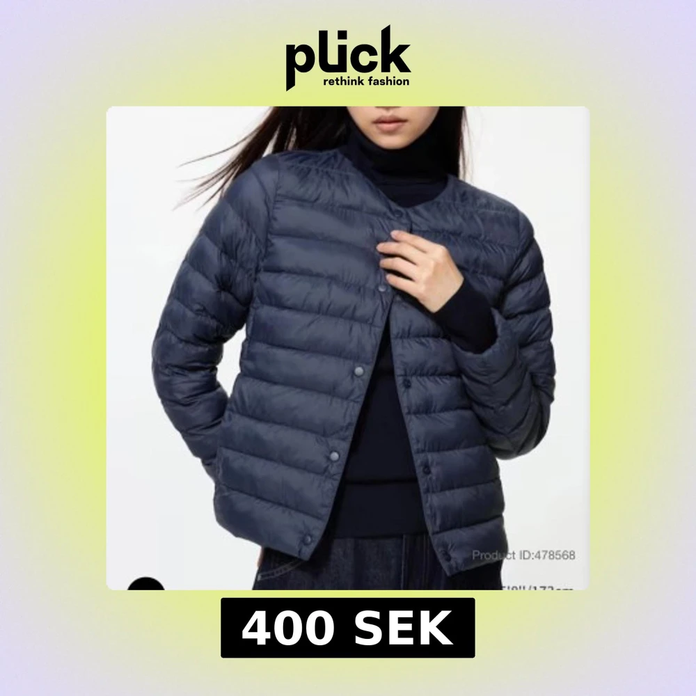 Snygg mörkblå dunjacka från Uniqlo med rund hals och knappar framtill. Jackan är lätt, har horisontella quiltade sömmar och lång ärm. Använd fåtal gånger