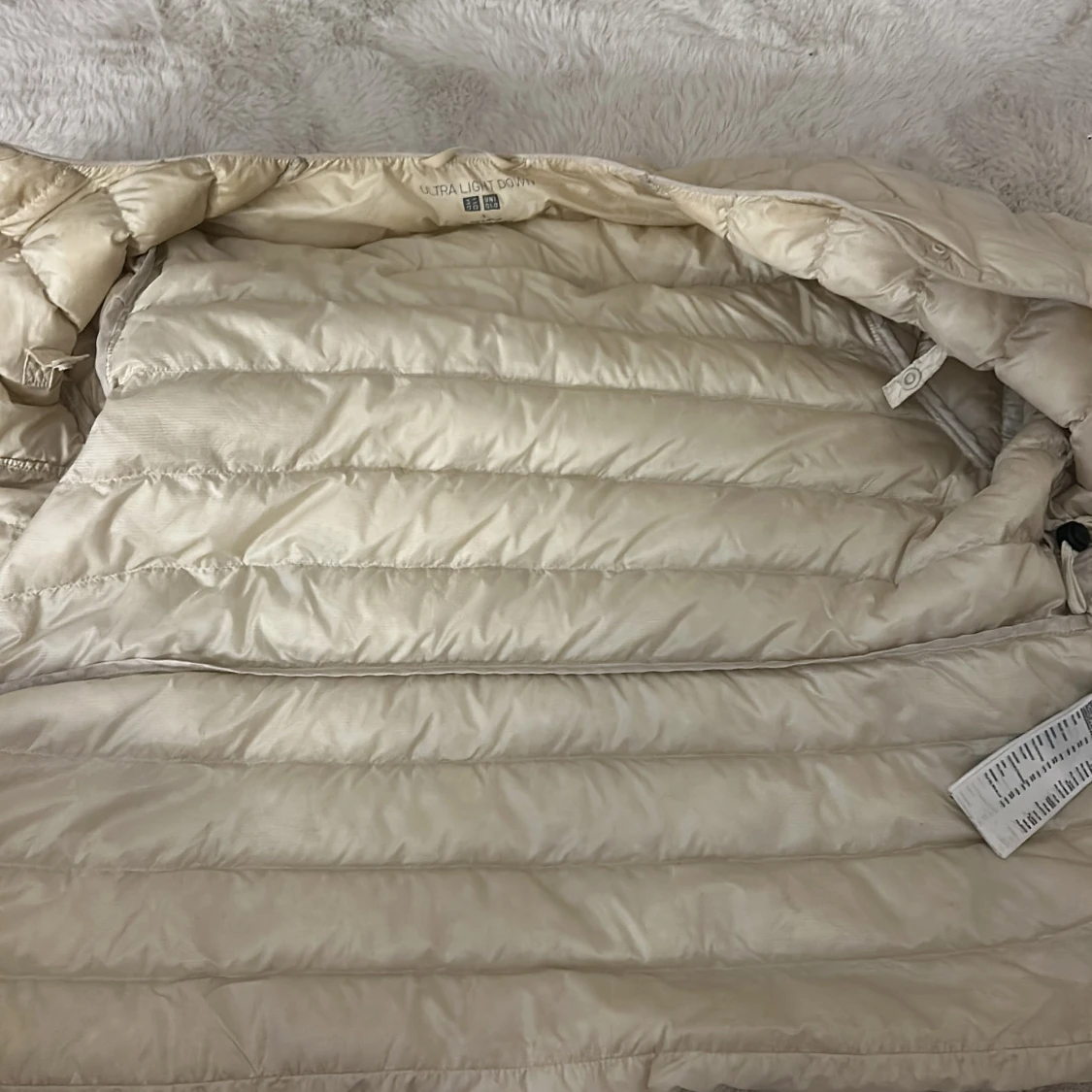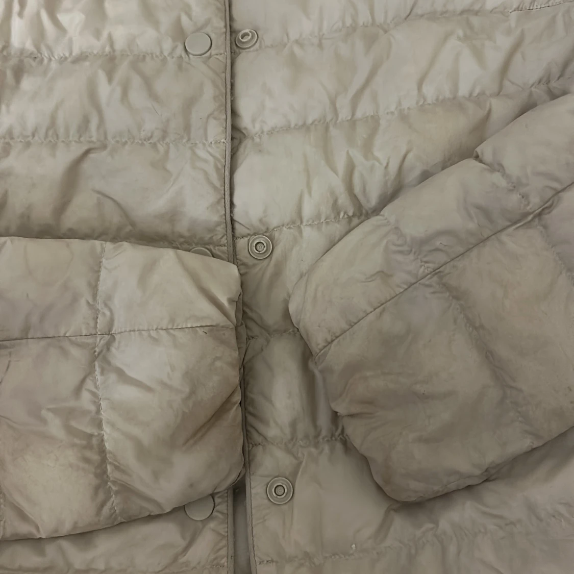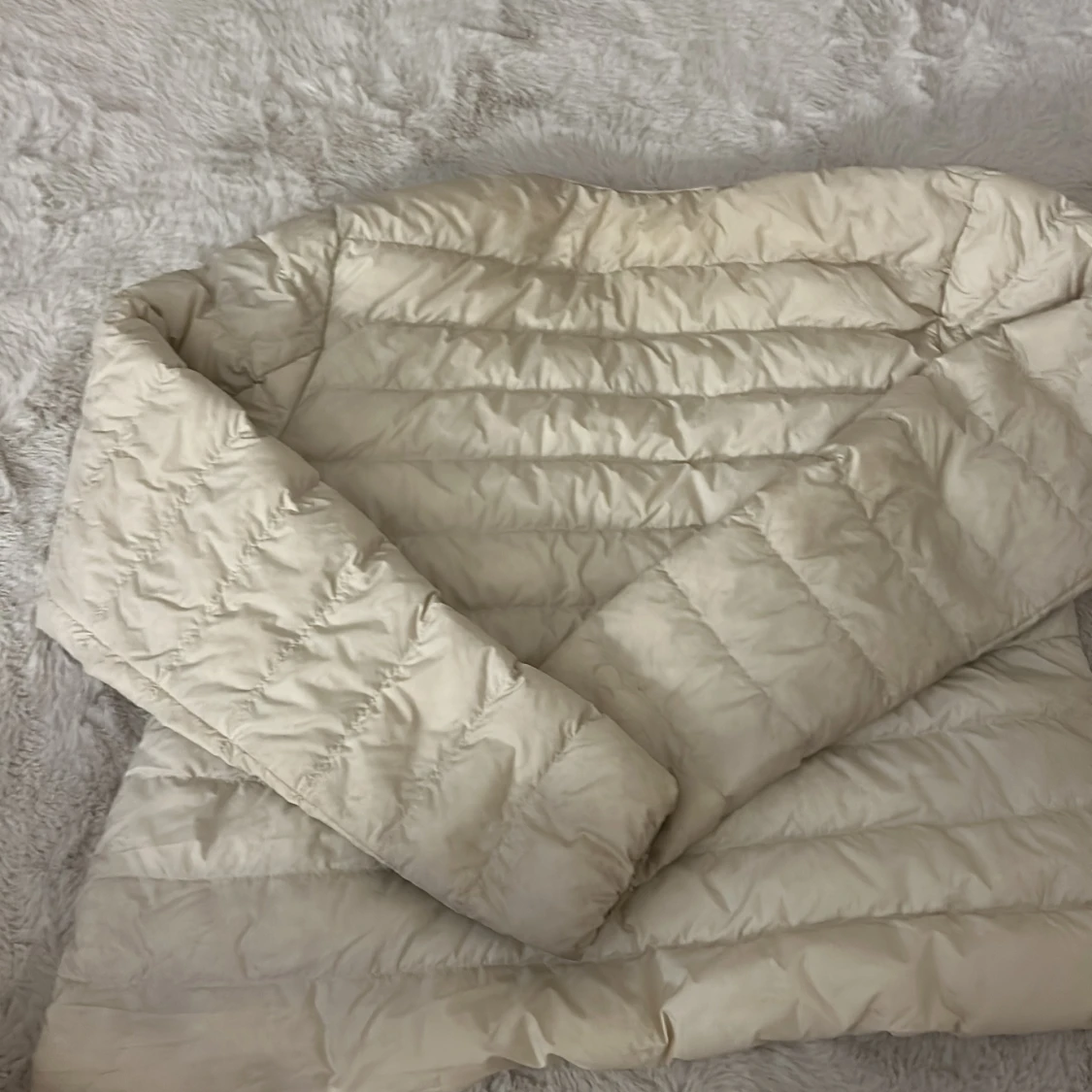 Jag säljer min uniqlo jacka för den inte kommer till användning ni ser på armarna längst ner det är för jag använde den på våren och för att den är begie den har inga hål eller nåt💕