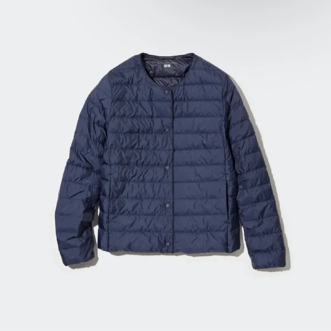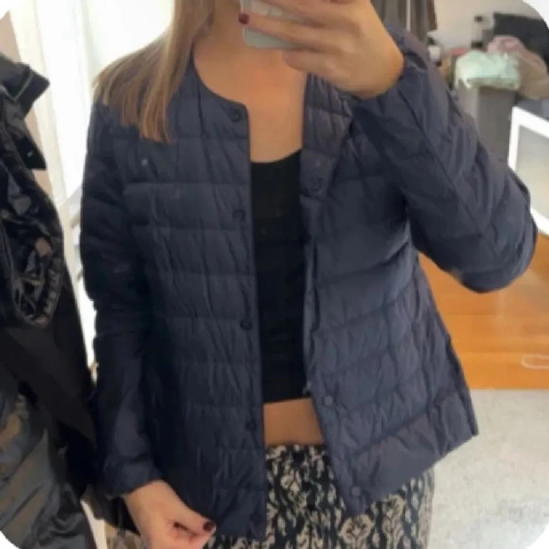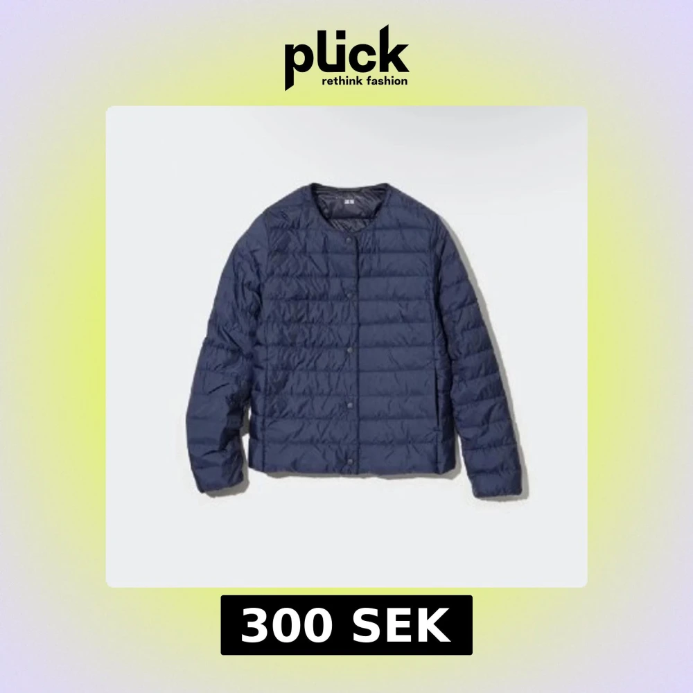 mörkblå, tunn och quiltad dunjacka från Uniqlo🌟🌟🌟storlek L men passar som en s tillomed xs!!