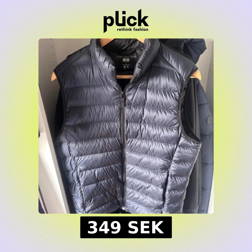 Säljer en svart, quiltad dunväst från Uniqlo Ultra Light Down. Västen har hög krage, dragkedja framtill och är superlätt. Perfekt att slänga över en hoodie eller tröja när det är kyligt ute.