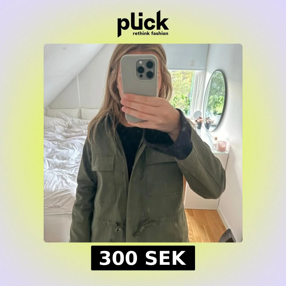 Snygg olivgrön jacka med dragsko i midjan och två stora bröstfickor. Jackan har dragkedja framtill och raka armar. Den är i mycket bra skick