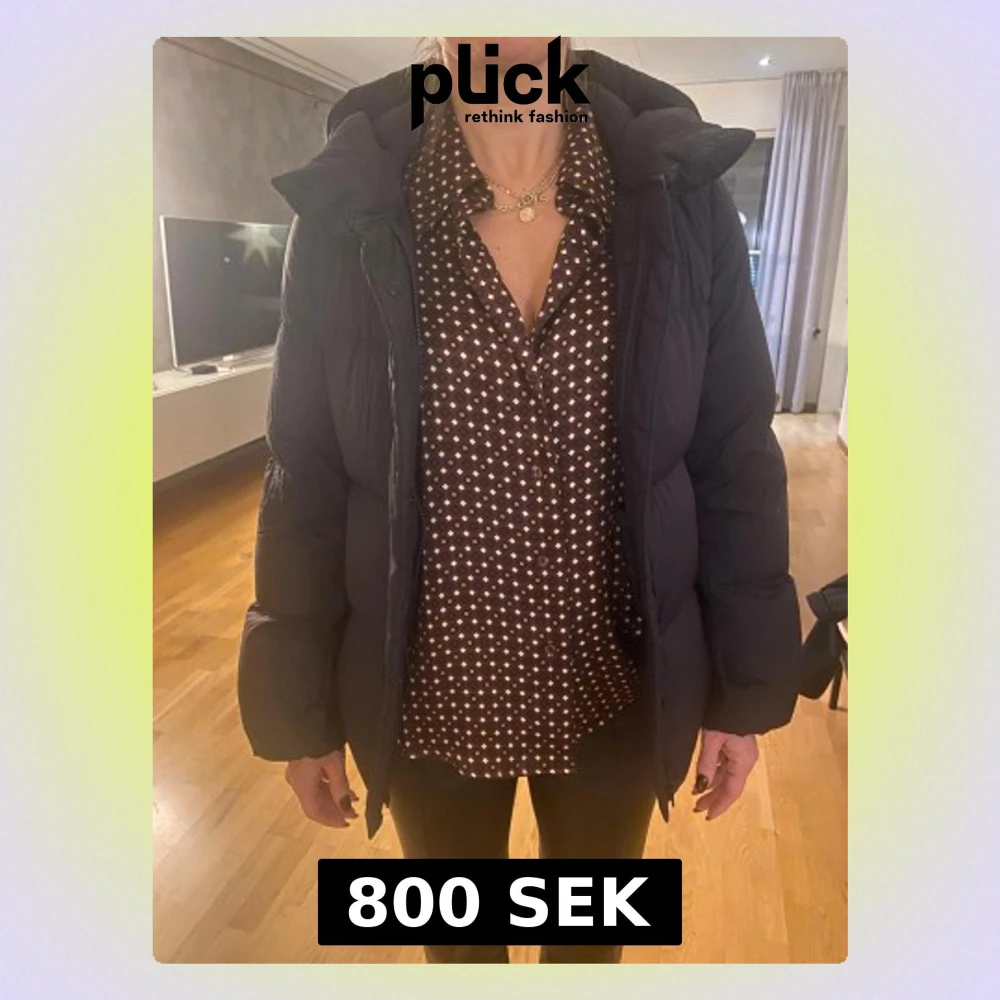 Säljer en svart dunjacka med stor, mysig huva och quiltad design. Jackan är från Uniqlo och använd ett fåtal gånger.