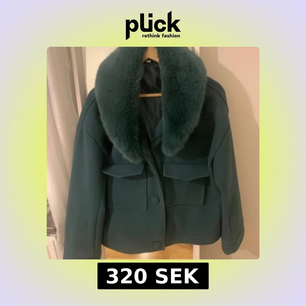 Snygg mörkgrön jacka med oversized pälskrage och stora fickor framtill. Jag köpte den begagnade så jag vet inte märket💕