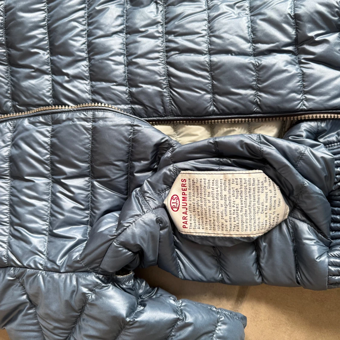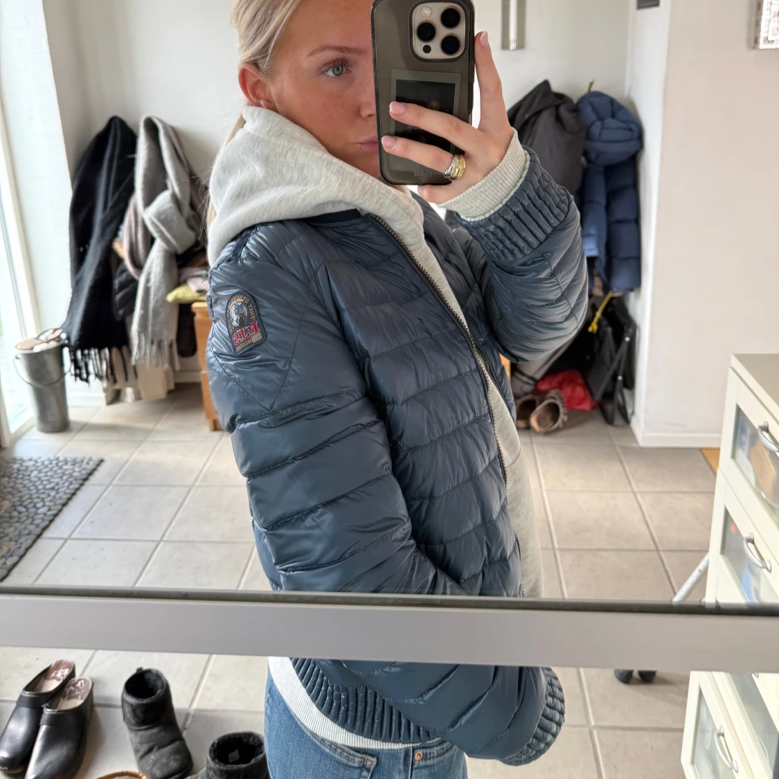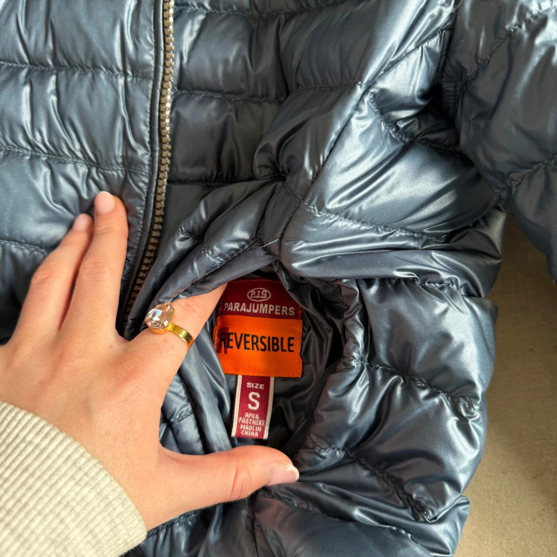 Säljer en vändbar dunjacka från Parajumpers i storlek S. Jackan har en stilren design med en sida i ljusgrå/silver och den andra i mörkblå. Den är quiltad och har dragkedja framtill. Perfekt för att variera din stil beroende på humör och väder.