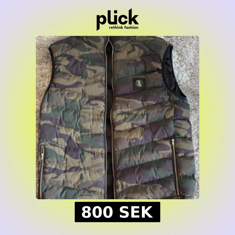 Säljer en vändbar dunväst från LH. Ena sidan har ett fett camouflage-mönster i grönt, brunt och beige med två dragkedjefickor, andra sidan är helsvart med två bröstfickor med knappar. Västen har hög krage och grov dragkedja framtill. Perfekt för dig som vill variera din stil.