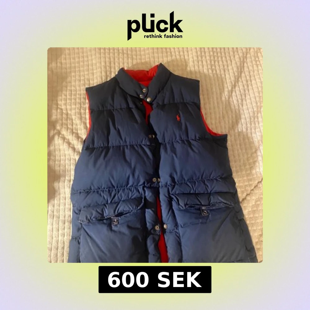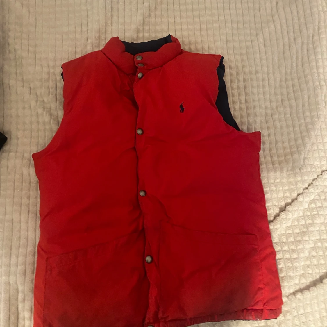 Snygg vändbar dunväst från Ralph Lauren i blått och rött. Västen har knappar och två fickor framtill. Perfekt för att hålla värmen med stil. Den är utmärkt skick. Passar även M. Priset kan diskuteras.