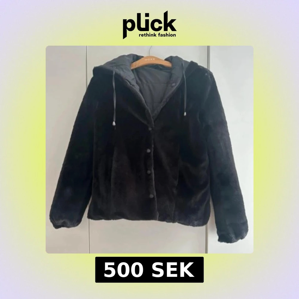 Svart täckjacka med mjuk fuskpäls på ena sidan och quiltad på andra sidan. Jackan har huva med snörning, tryckknappar framtill och långa ärmar. Perfekt för dig som gillar en chill och varm look under höst och vinter