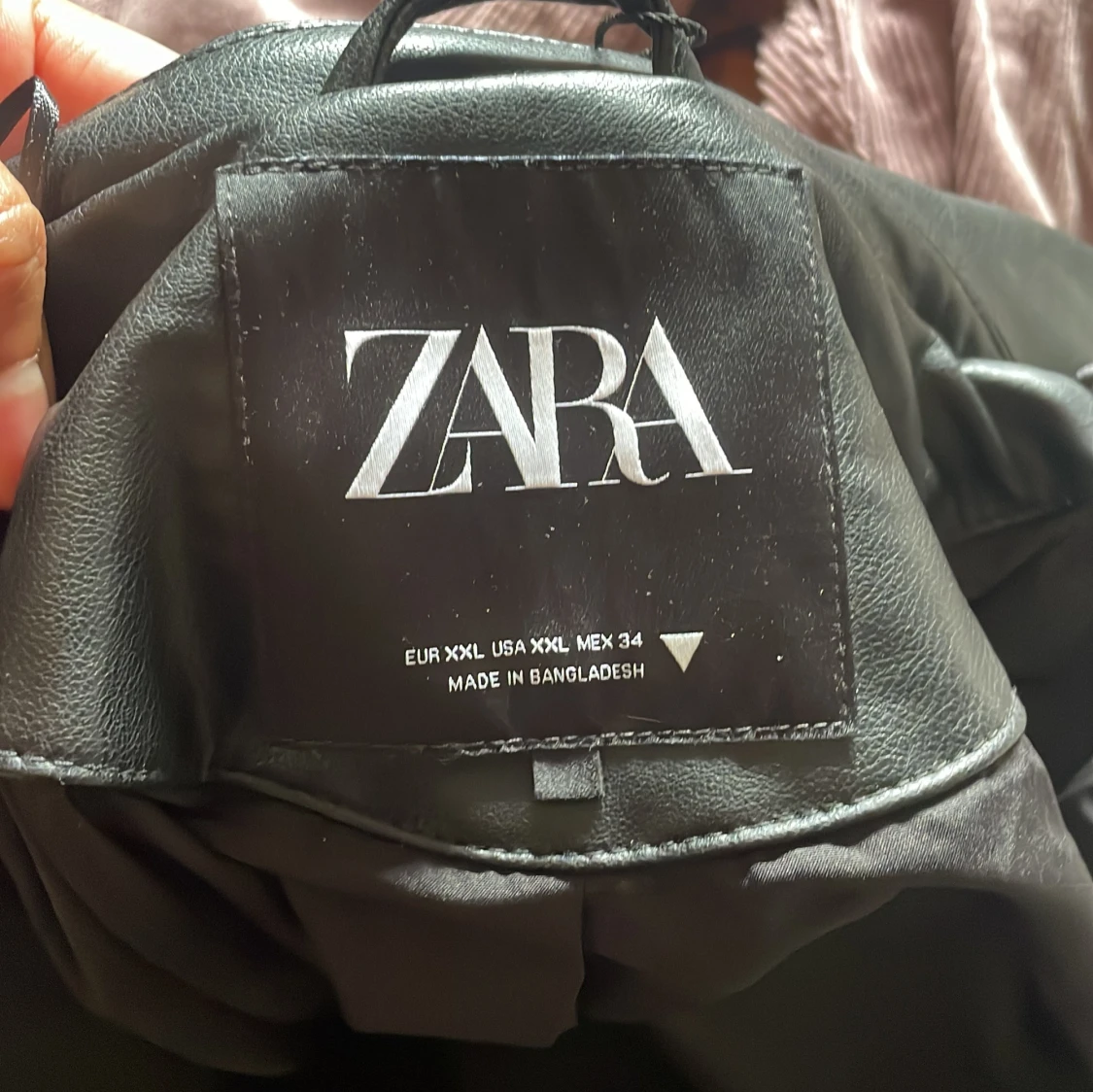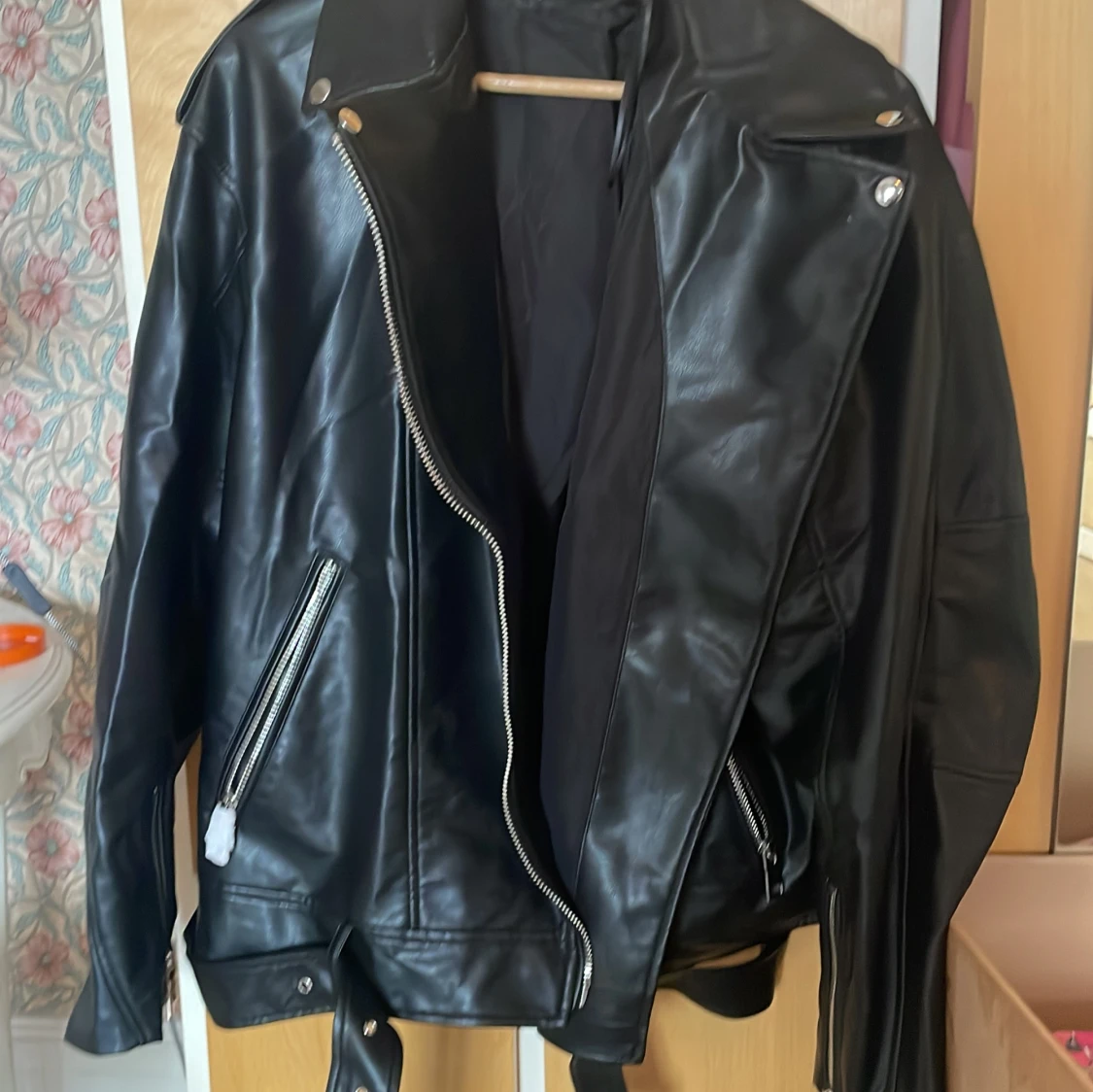 Säljer en svart skinnjacka från Zara i storlek XXL. Jackan har klassisk bikerstil med sned dragkedja, stora slag och bälte nedtill. Flera fickor med dragkedja och coola detaljer i silver. Perfekt för dig som vill ha en edgy look.