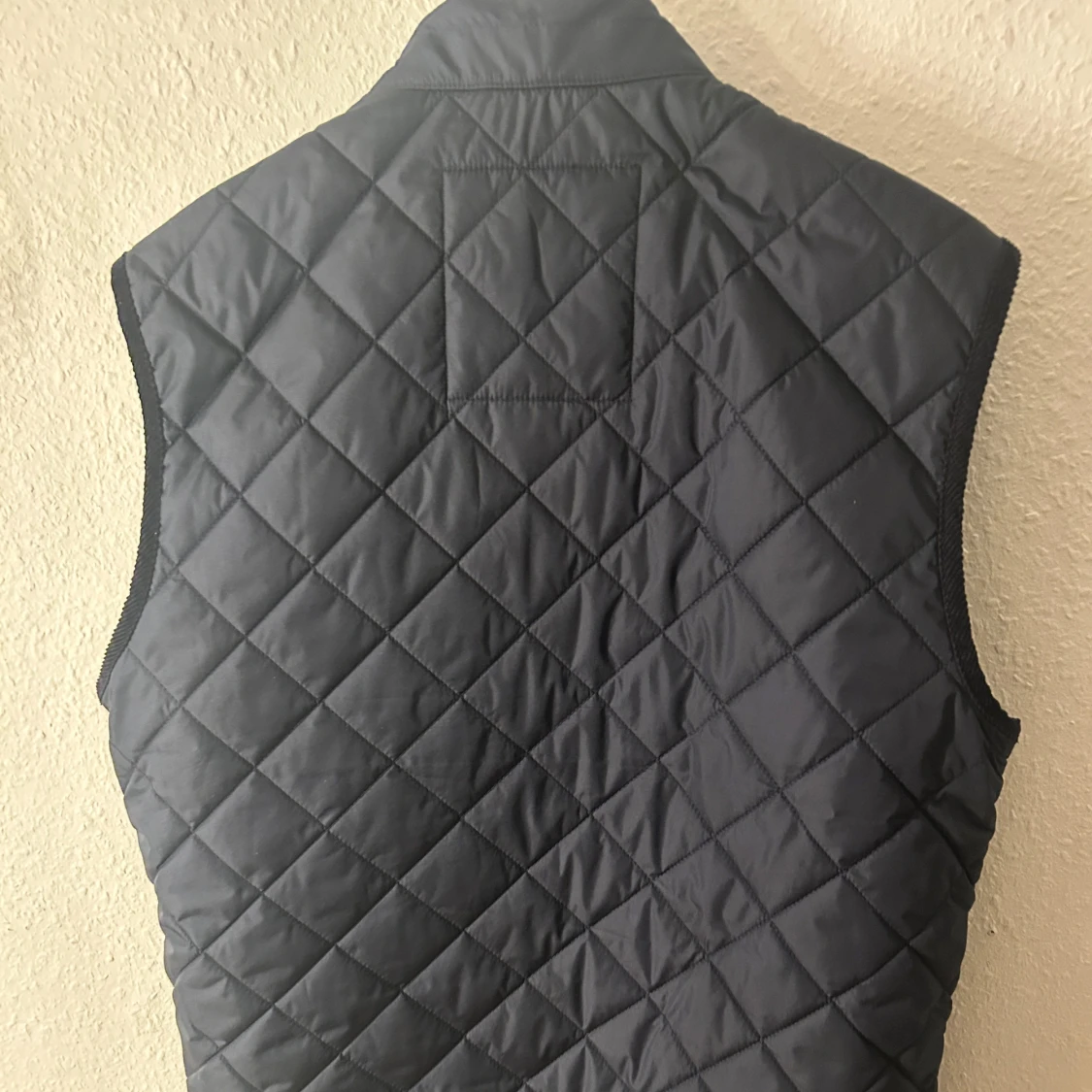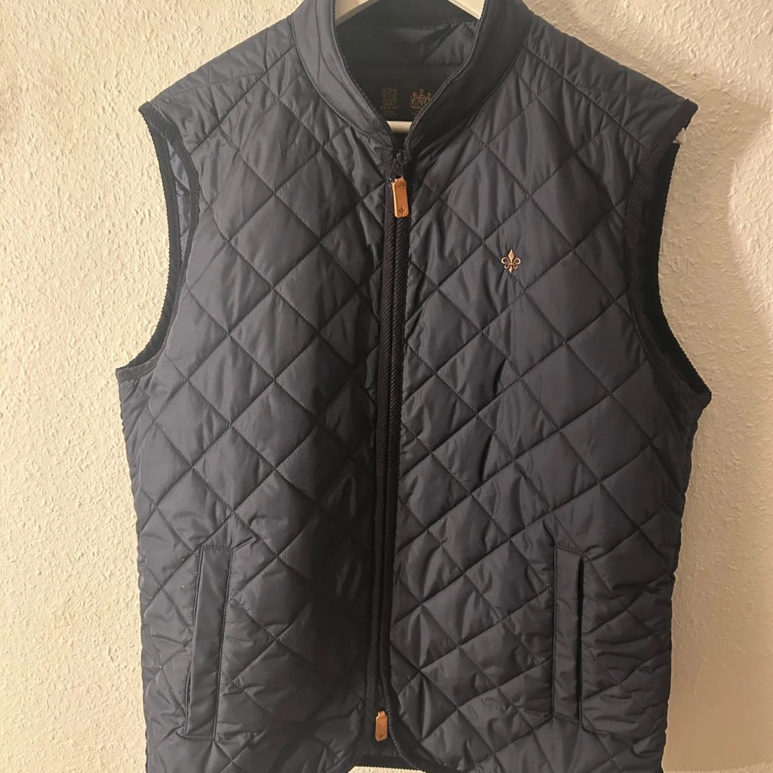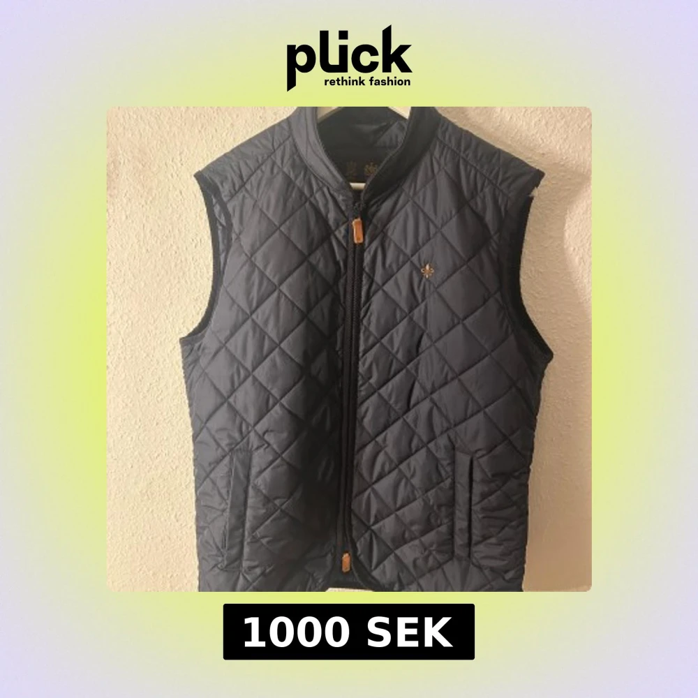 Snygg mörkblå quiltad väst med en broderad detalj på bröstet. Perfekt för lager-på-lager under kyligare dagar eller varmare dagar . Västen har en stilren design och är knappt använd. Skick 9/10