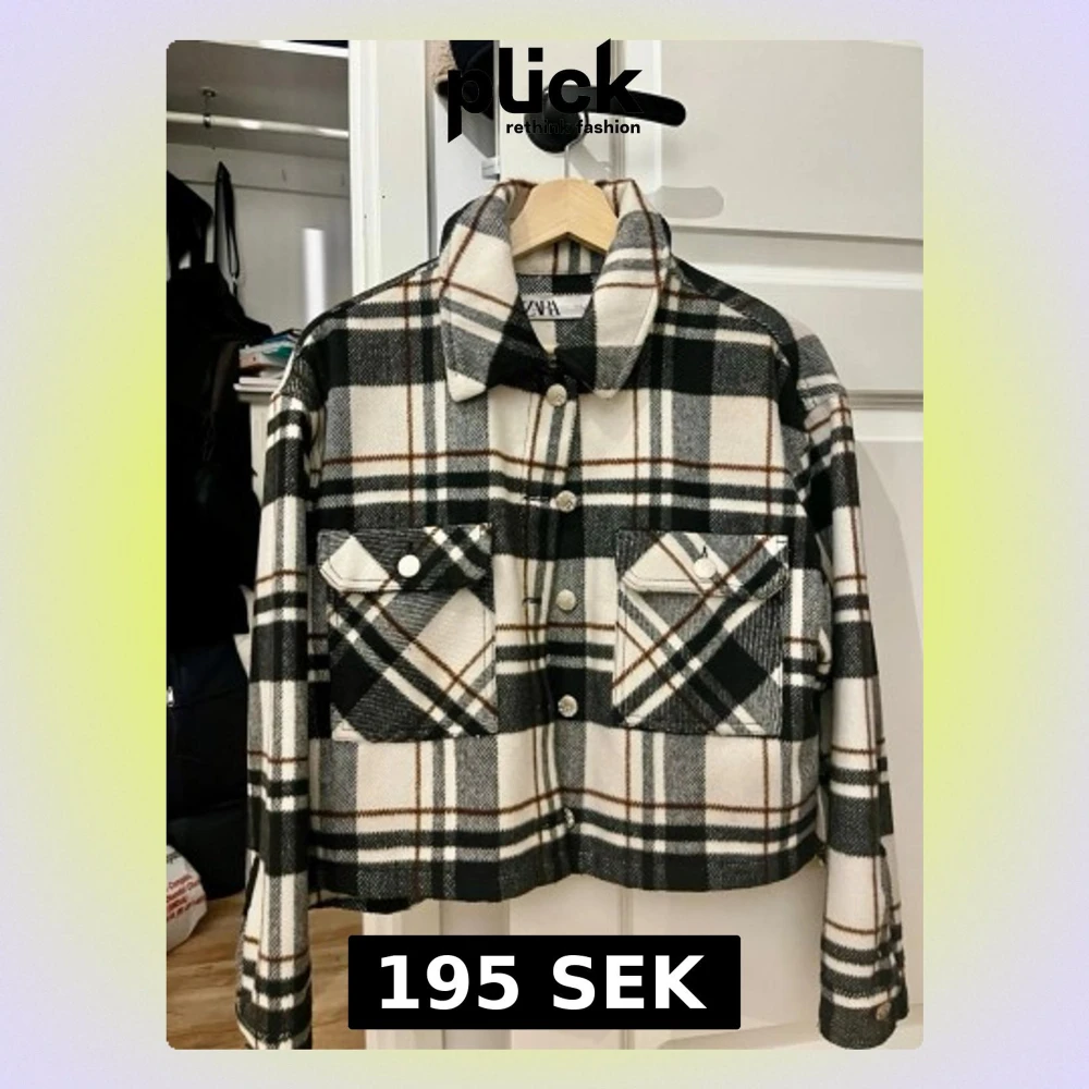 Säljer en snygg rutig overshirt från Zara i svart, vitt och brunt. Jackan har två stora bröstfickor med knappar, klassisk krage och raka ärmar. Perfekt för lager på lager under höst och vår.
