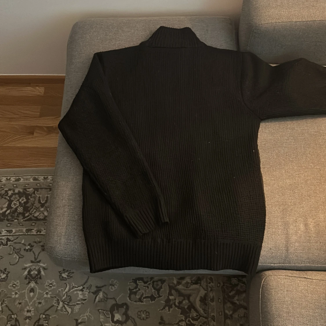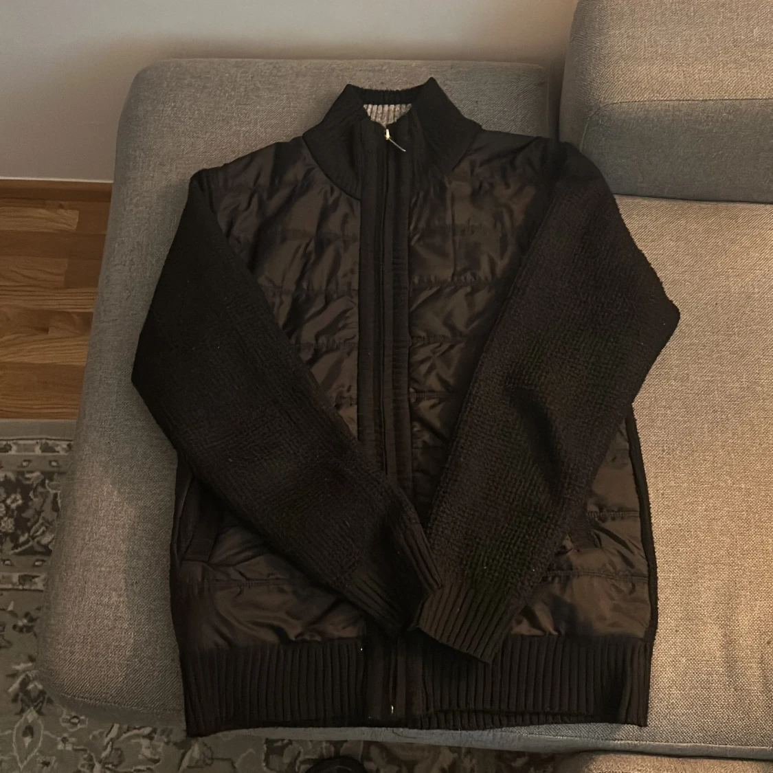 Säljer en svart jacka med quiltad front och stickade ärmar. Jackan har dragkedja framtill och ribbade muddar. Perfekt för kyliga dagar när du vill ha både stil och komfort.