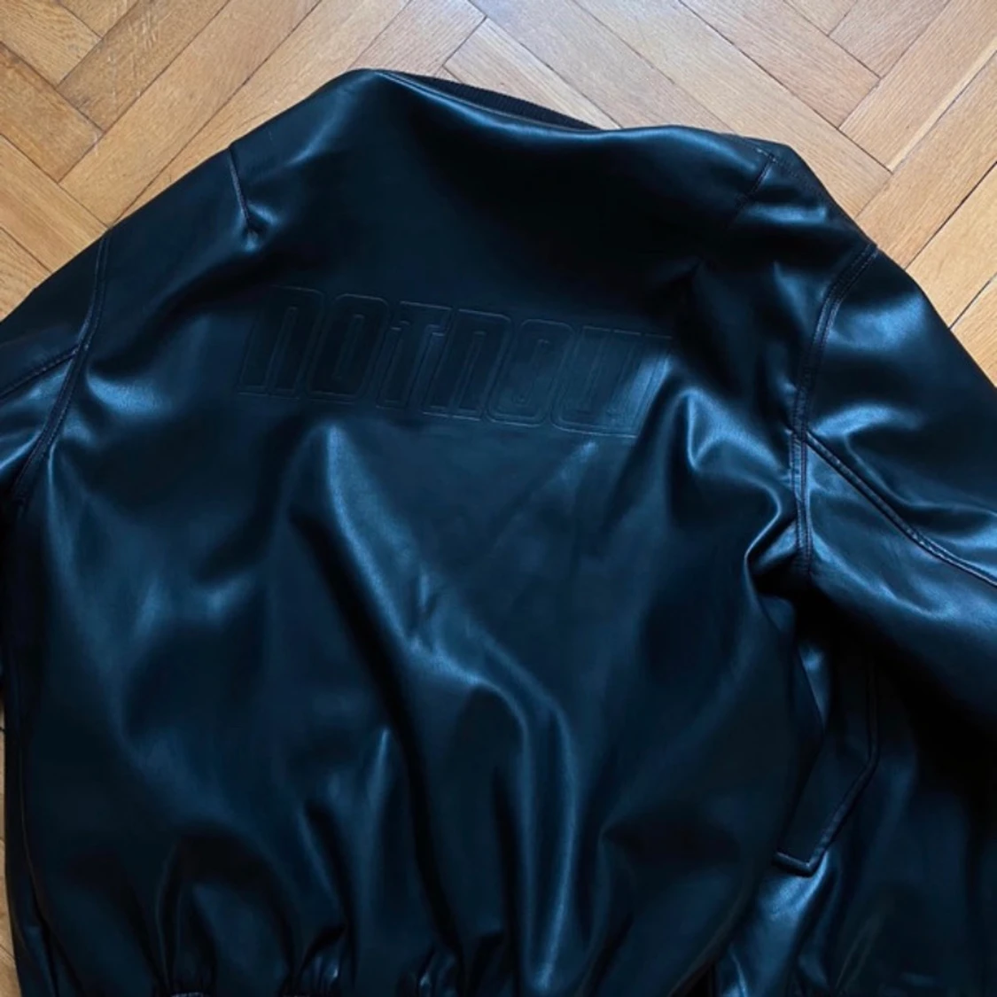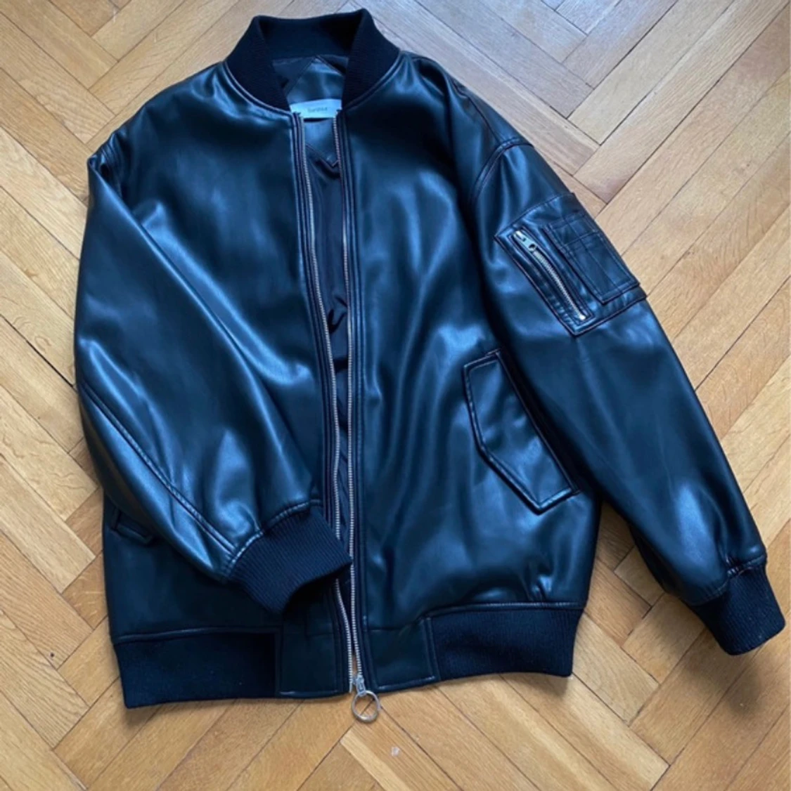 En svart bomberjacka i fake skinn ifrån bershka i storlek M/L. Den har ett litet tryck på ryggen men som inte syns jättemycket (se bild 2 vs bild 3). Köpt begagnad men aldrig använd av mig och skulle bedöma den i ett gott skick, näst intill nyskick💕