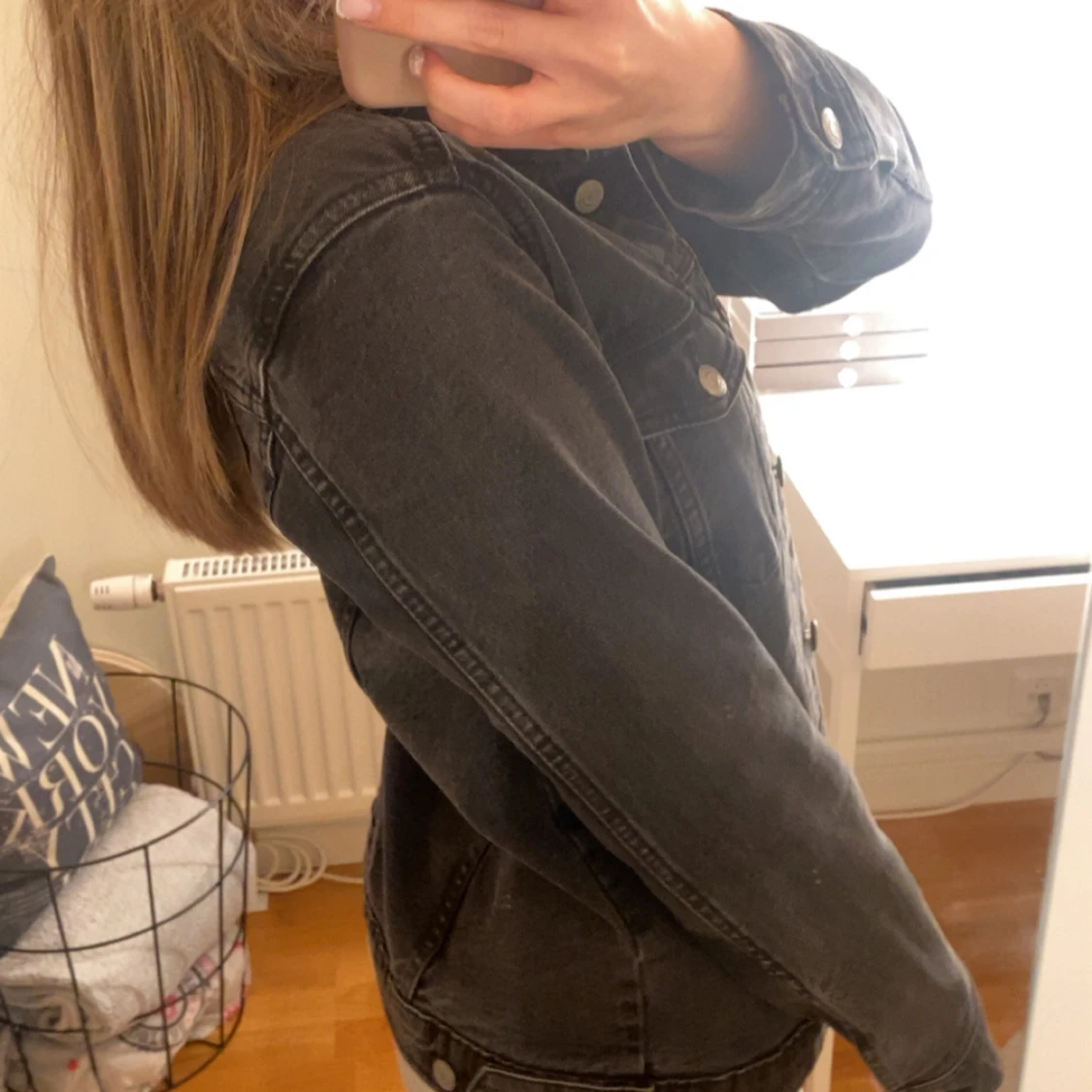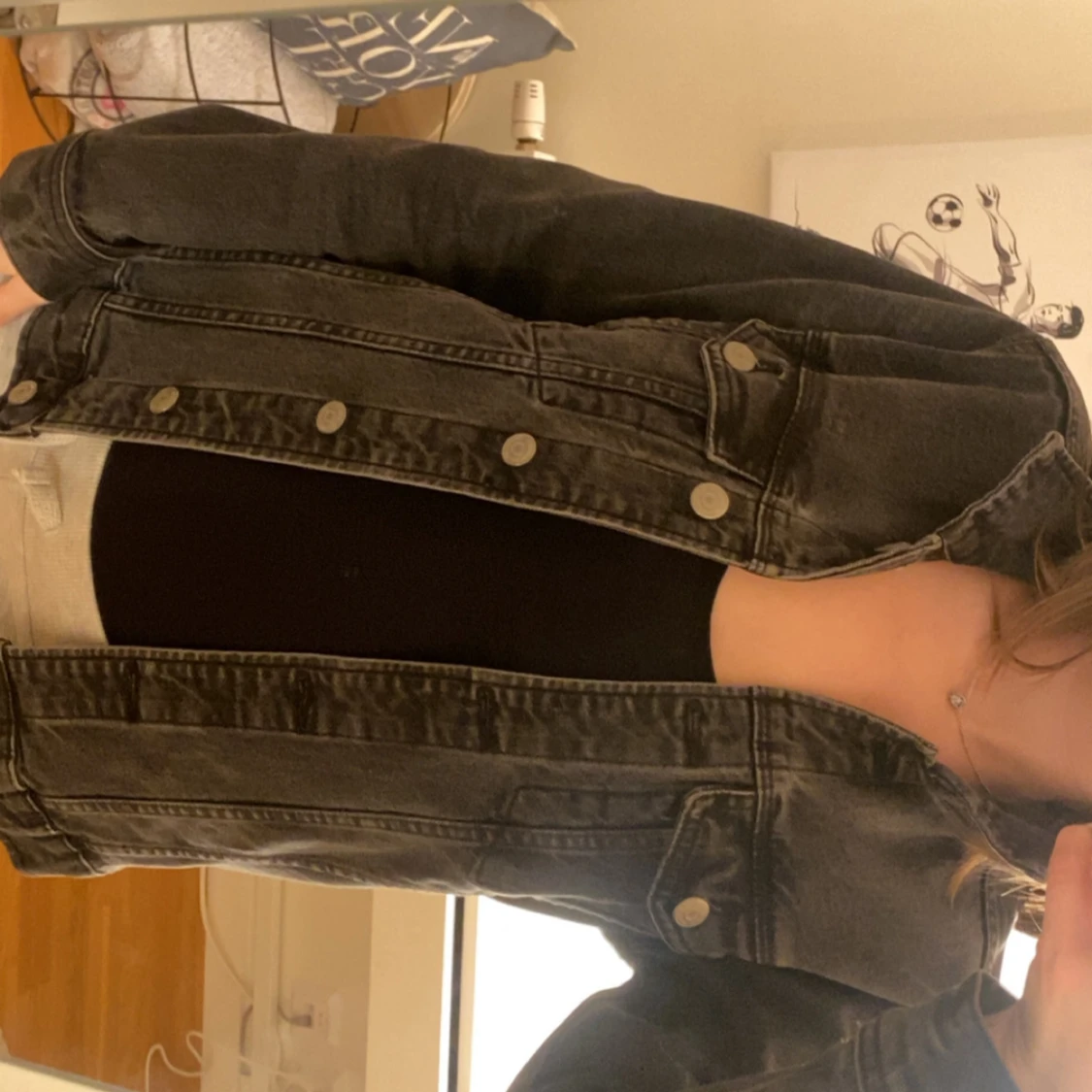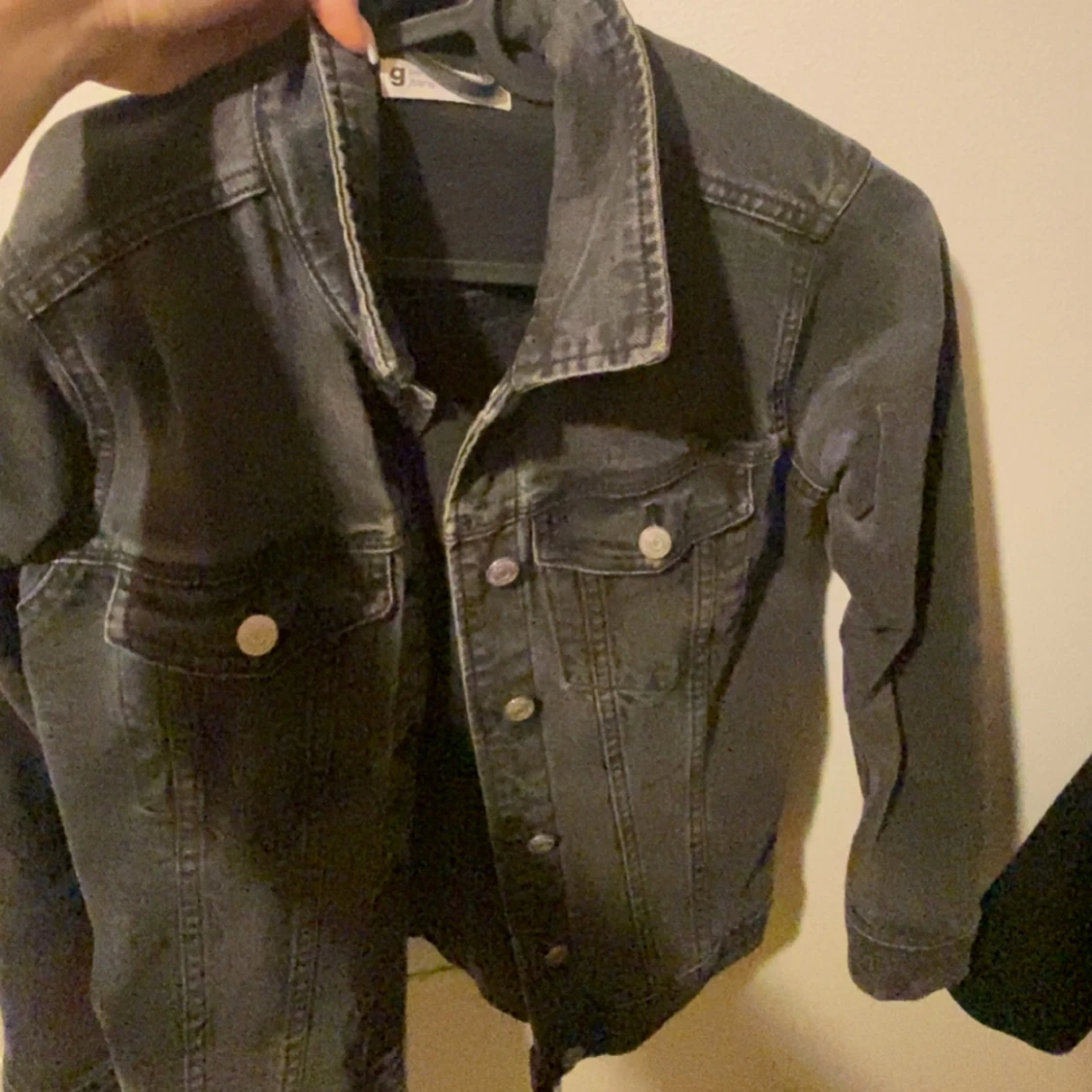 Säljer en svart jeansjacka från Gina Tricot med klassisk design och silverfärgade knappar. Jackan har två bröstfickor med lock och knäppning framtill. Perfekt att slänga över en t-shirt eller hoodie.
