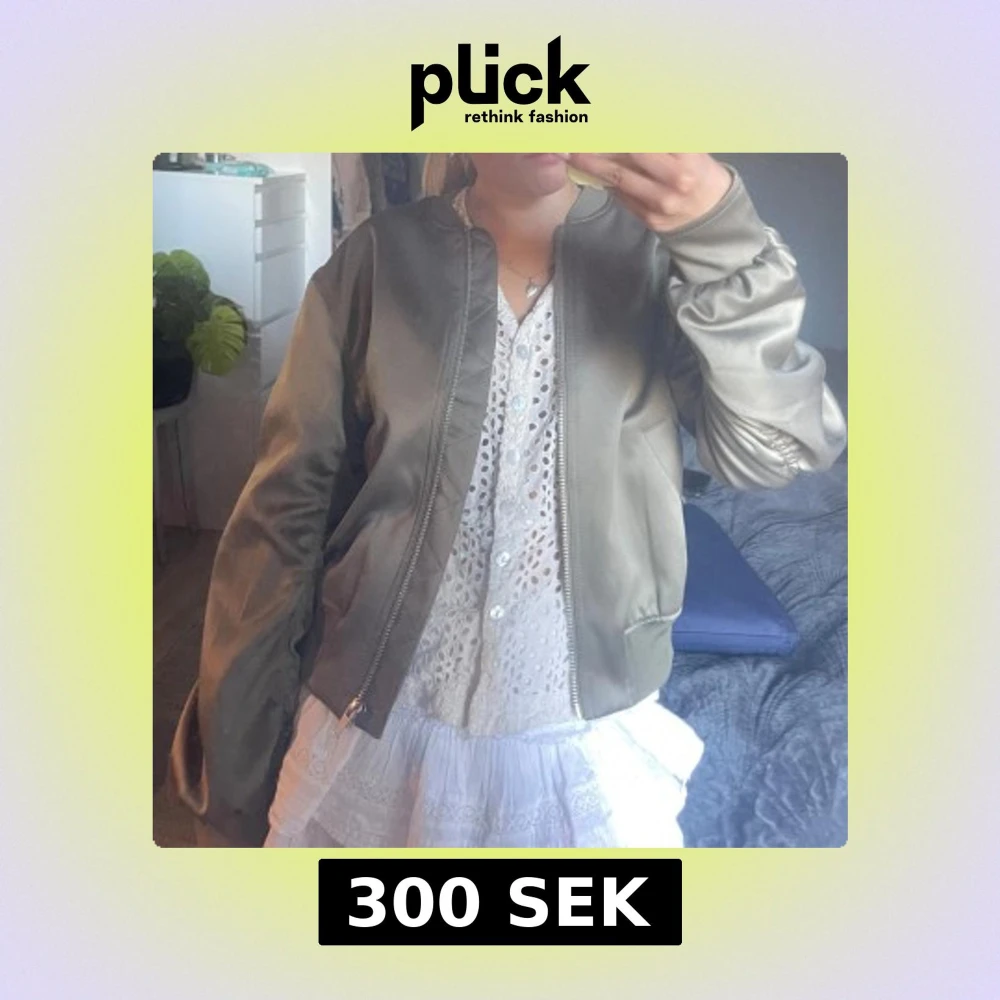 Snygg olivgrön bomberjacka med dragkedja framtill och ribbade muddar vid ärmslut och midja. Jackan har en klassisk bombermodell och är tillverkad i ett slätt, glansigt material.