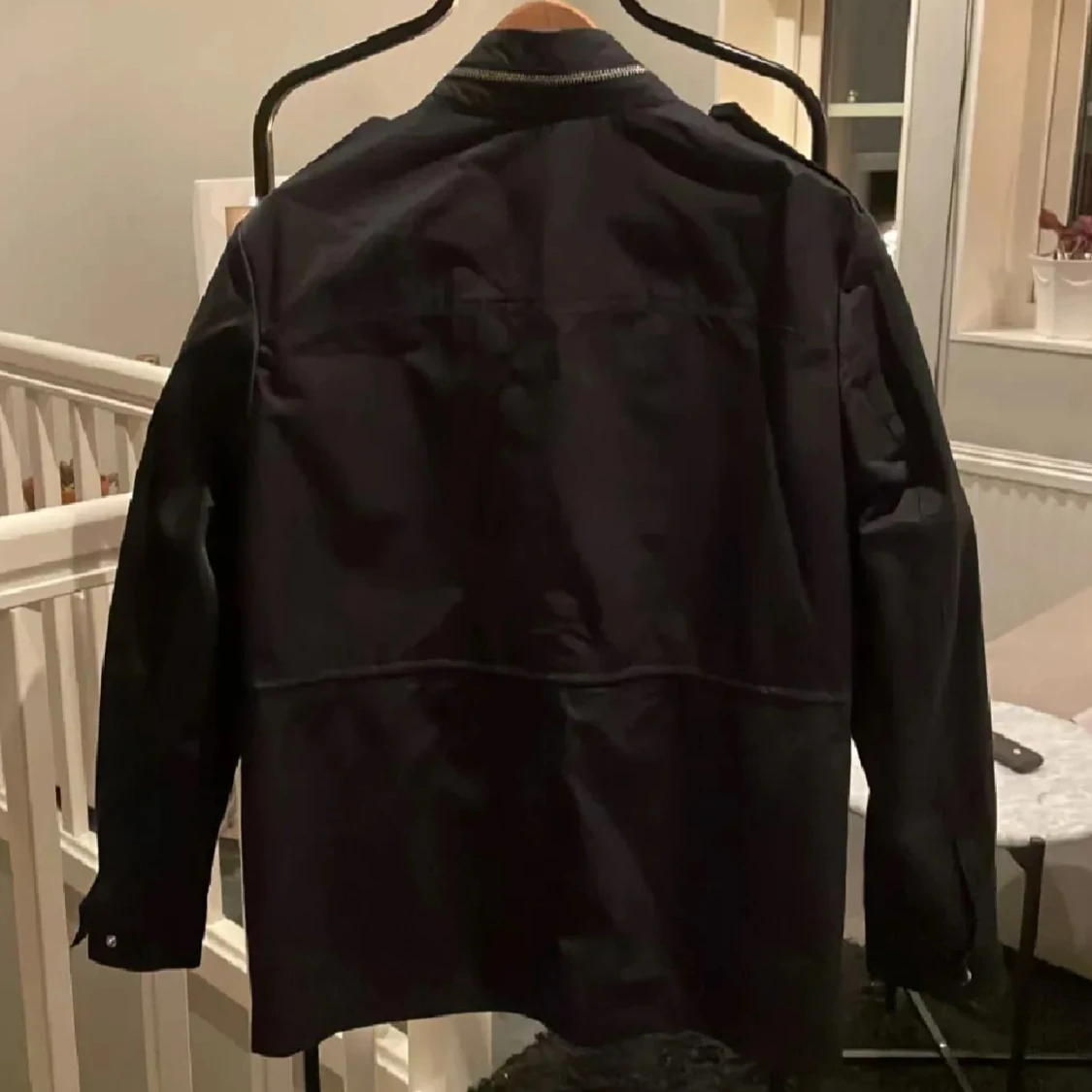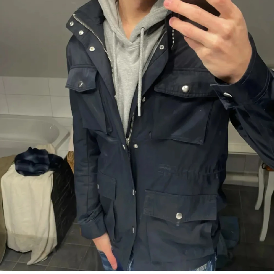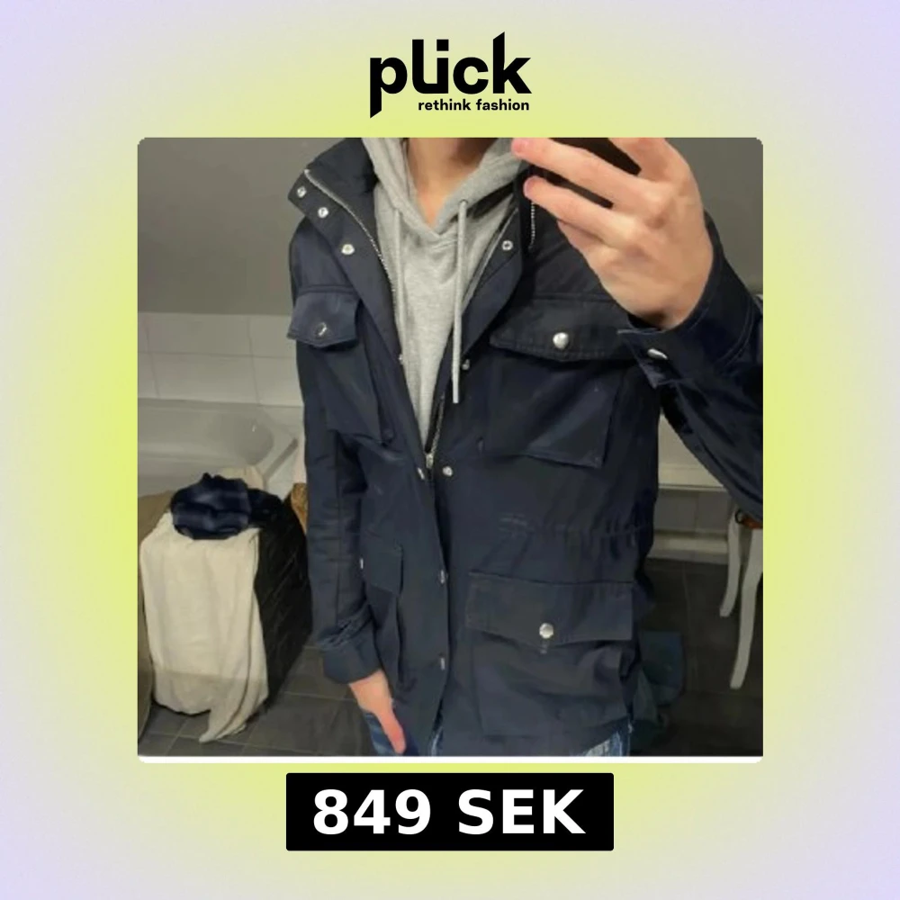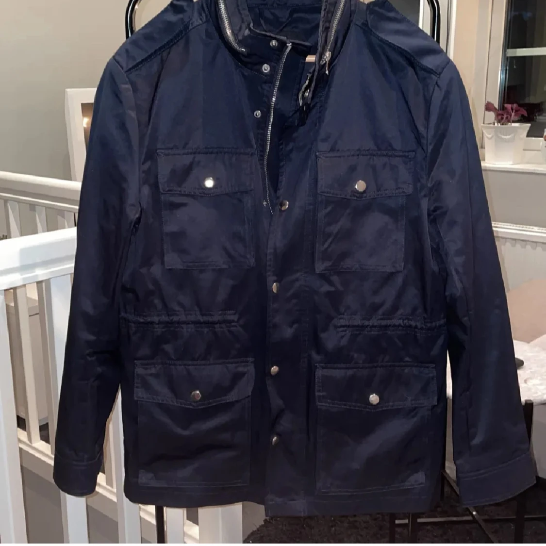 Snygg mörkblå vindjacka med fyra stora fickor framtill och dragkedja samt tryckknappar. Jackan har hög krage och långa ärmar, perfekt för blåsiga dagar. Enkel och stilren design som passar till det mesta.