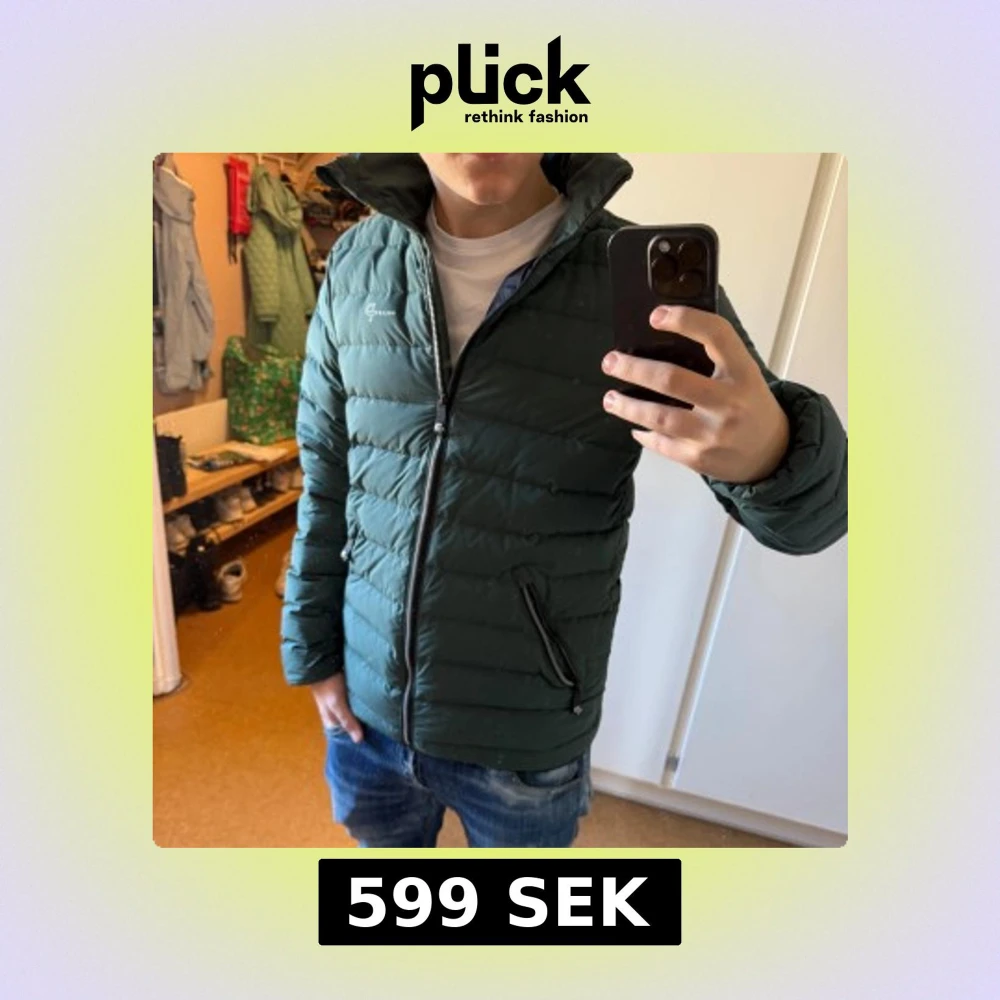 Säljer en snygg grön dunjacka från Pelle P. Jackan har en dragkedja framtill och praktiska fickor med dragkedjor. Perfekt för kyligare dagar med sin vadderade design.