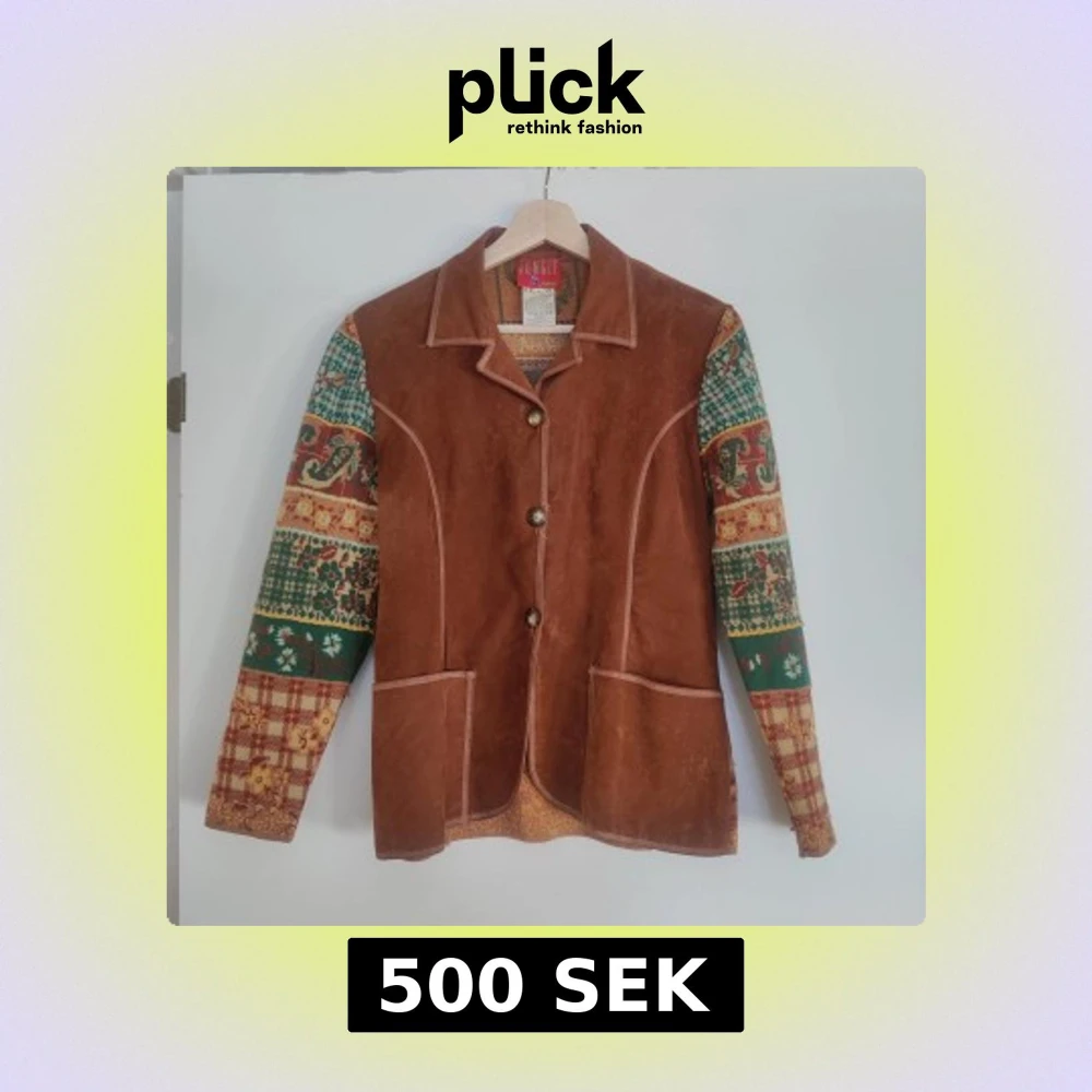 Unik brun mockajacka från Kenzo med färgglada mönstrade ärmar i grönt, rött och gult. Jackan har knappar framtill och två fickor. Perfekt för dig som vill sticka ut med en stilfull och annorlunda look.