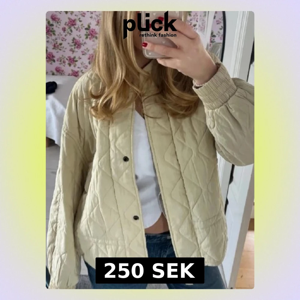 Quiltad beige jacka med oversized passform och långa ärmar. Jackan har tryckknappar framtill och resår vid ärmsluten. Perfekt för lager-på-lager. I nyskick!