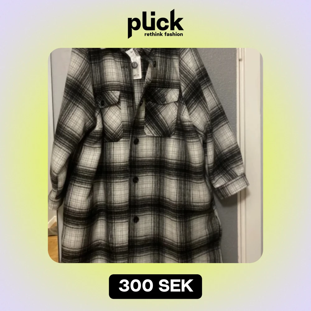 Skjortjacka i ett svartvitt rutigt mönster som passar de flesta garderober. Jackan har krage och knappar framtill. Den har två bröstfickor med knappar, fickor och slits på sidorna. Extra knapp och lappar kvar.