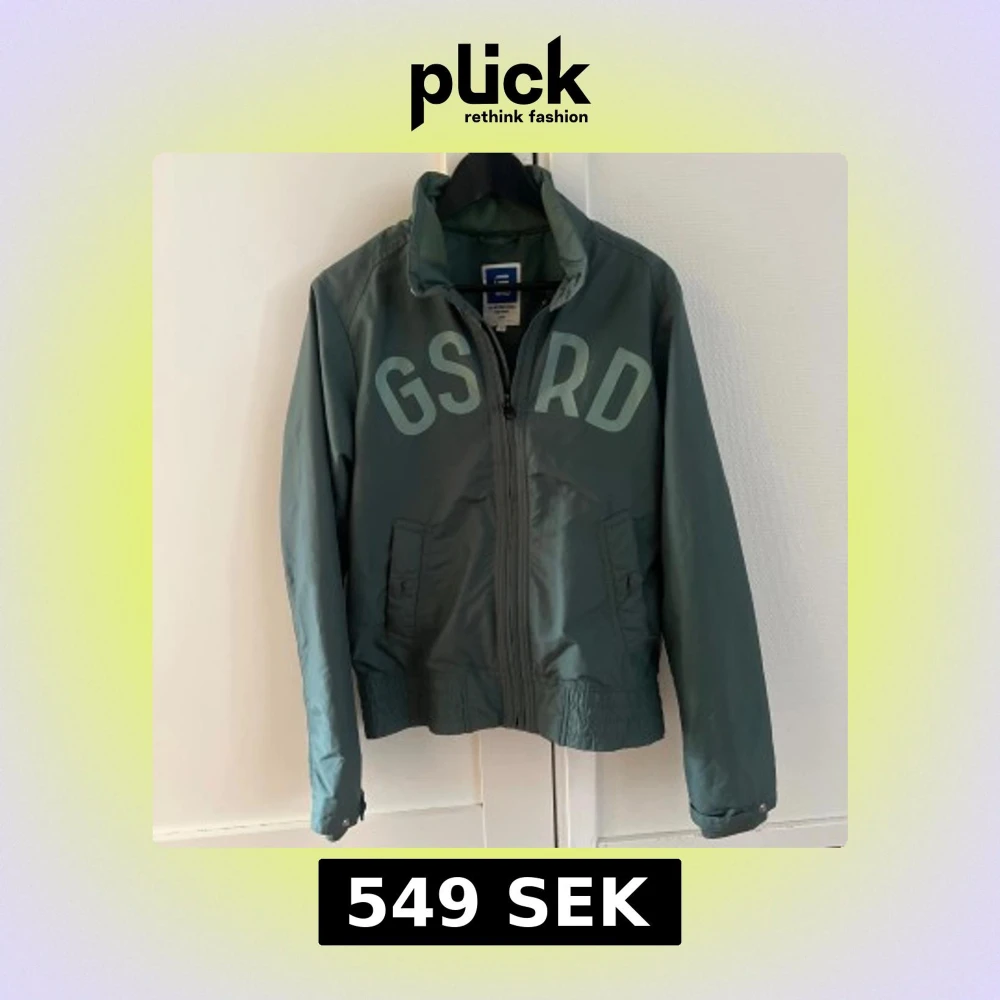 Snygg grön jacka från G-Star RAW med stor text 'GSRD' på framsidan. Jackan har dragkedja och ribbade detaljer vid ärmslut och nederkant. Perfekt för en stilren look.