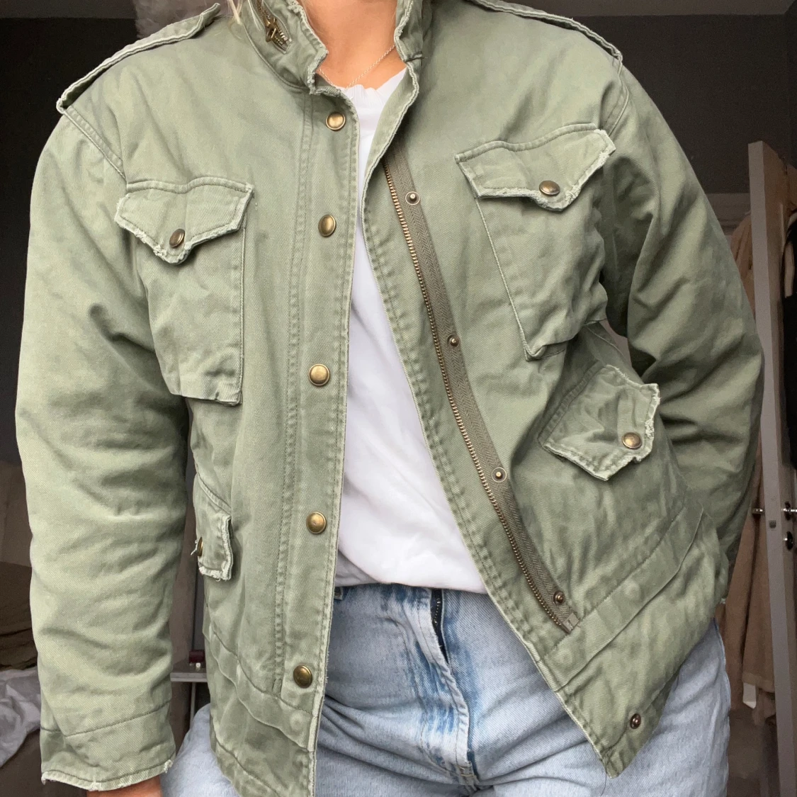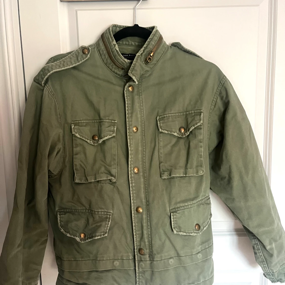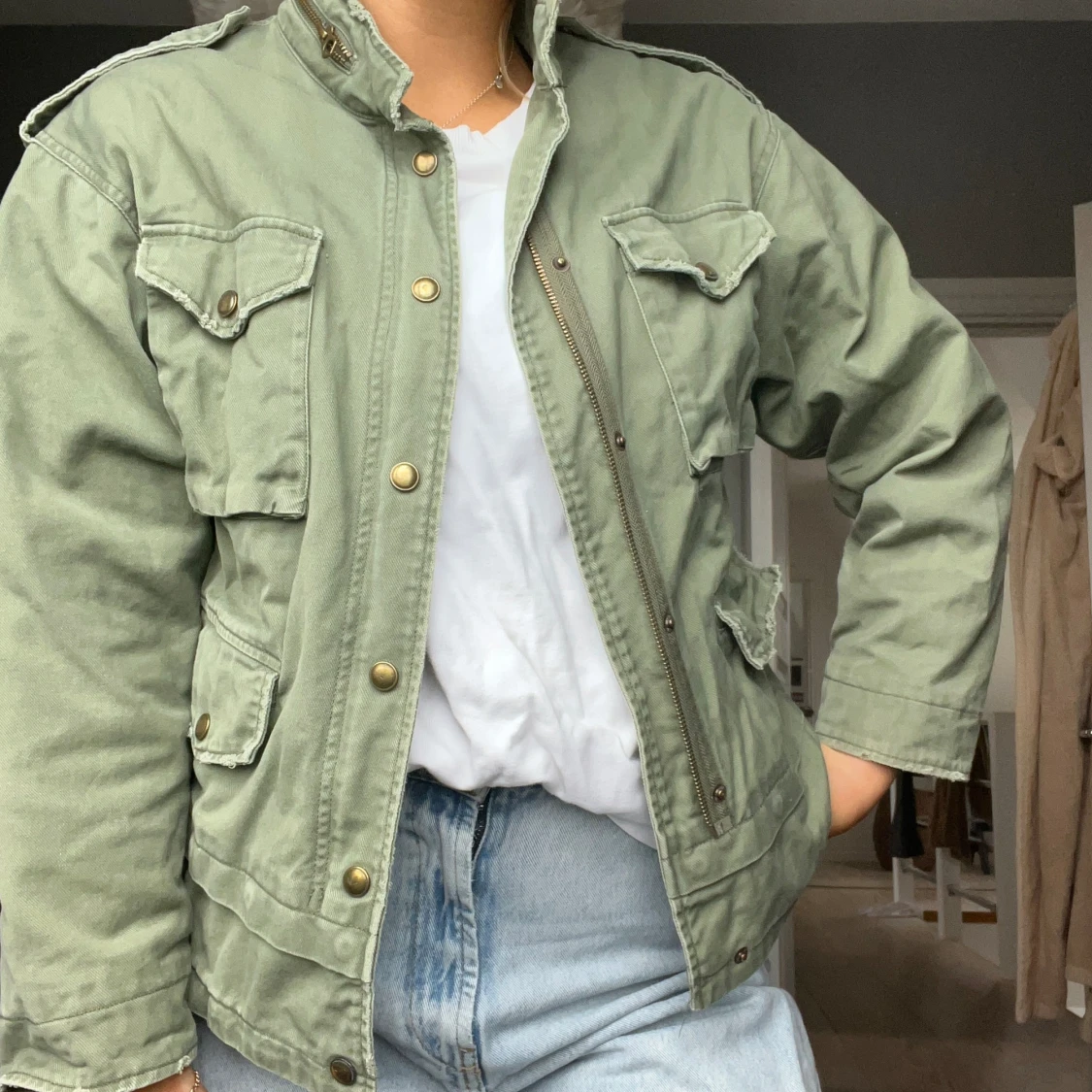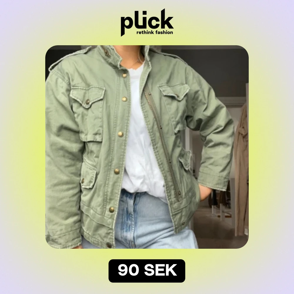 Grön tygjacka från zara, storlek XS men är oversize i modellen så skulle säga beroende på hur man vill att den sitter S / liten M. Detaljer på ryggen.